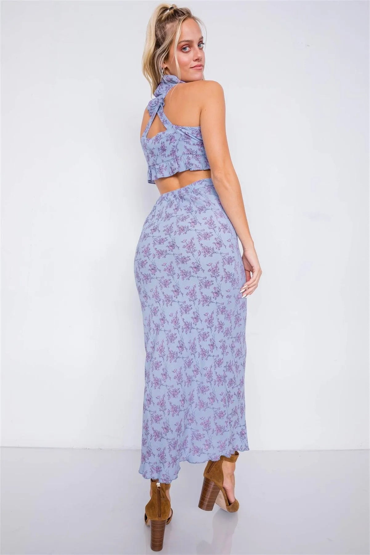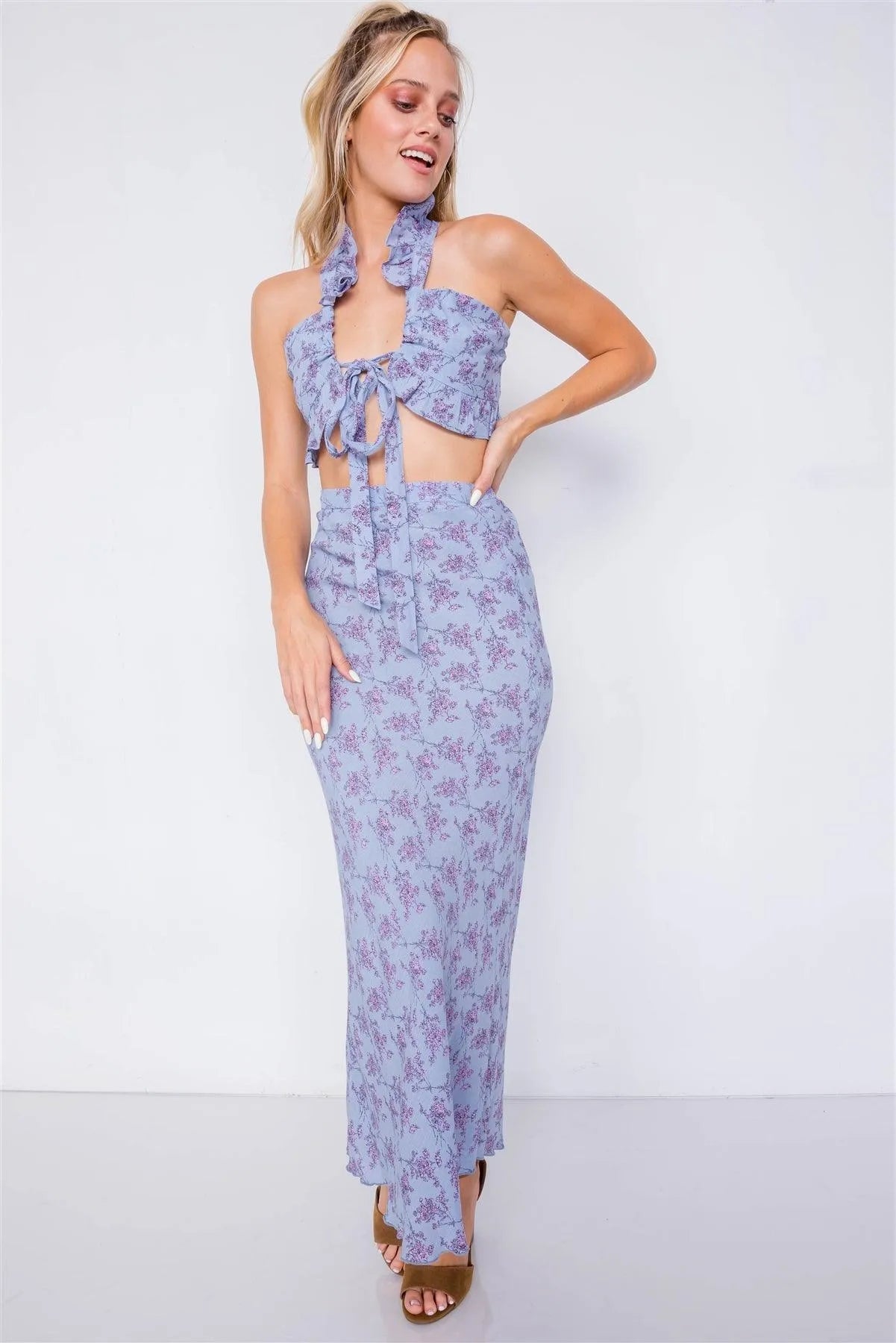 Flower Mini Boho Print Lace Up Crop Top & High-Waist Frill Trim Maxi Skirt Set /3-2-1