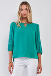 🖤Item Features: Forest green, solid color, round cut-out neckline, laser-cut embroidery trim on 3/4 (midi) balloon sleeves with elasticized hems, split bottom back detail, uneven front & back length, relaxed fit, unlined, non-sheer, non-stretch, casual, light, boho, summer vibes, spring/summer collection