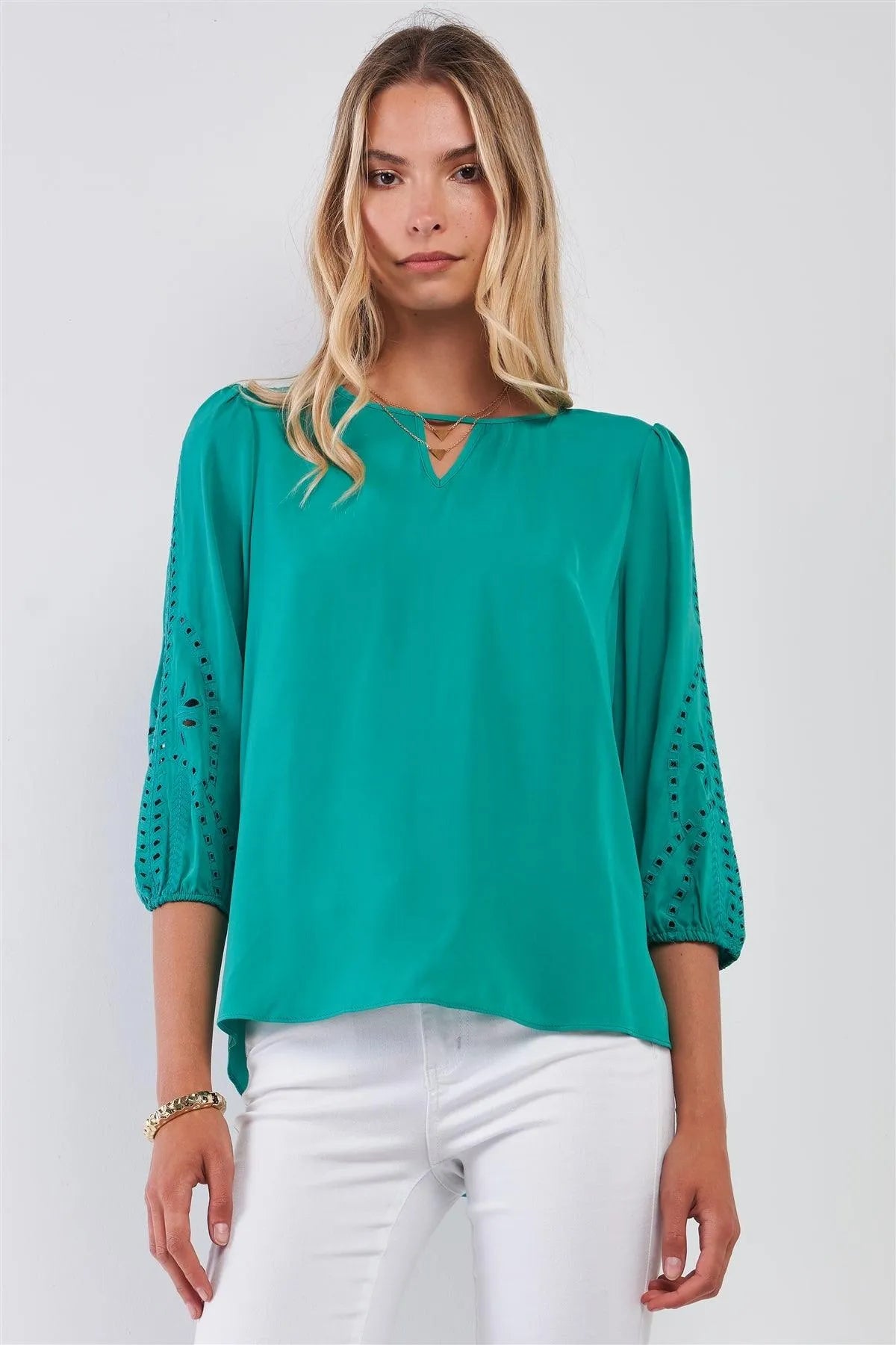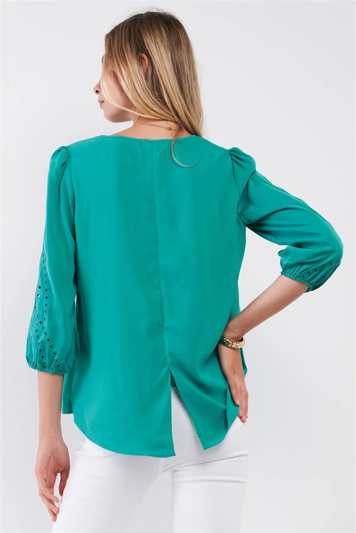 Forest Green Boho Laser-Cut Embroidery Trim Balloon Sleeve Relaxed Blouse Top /1-1-2-2