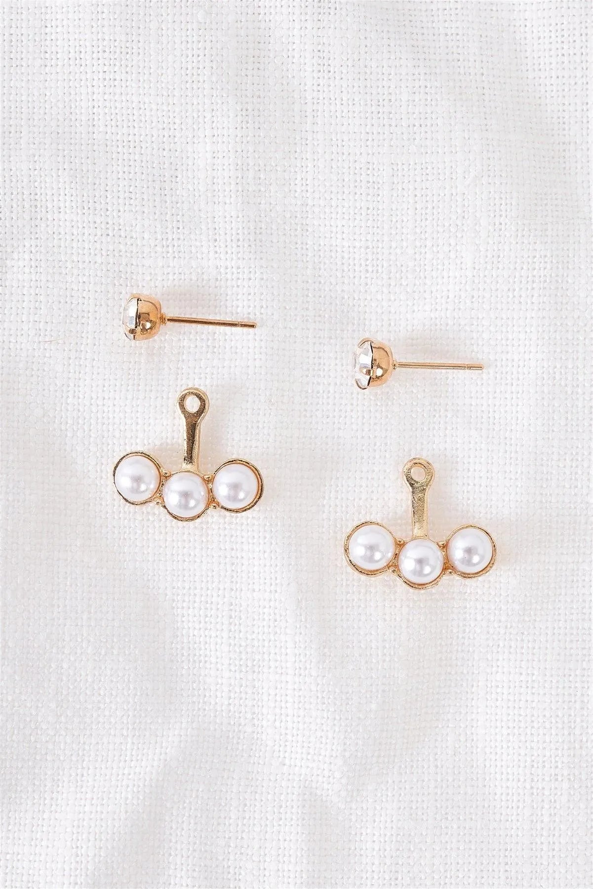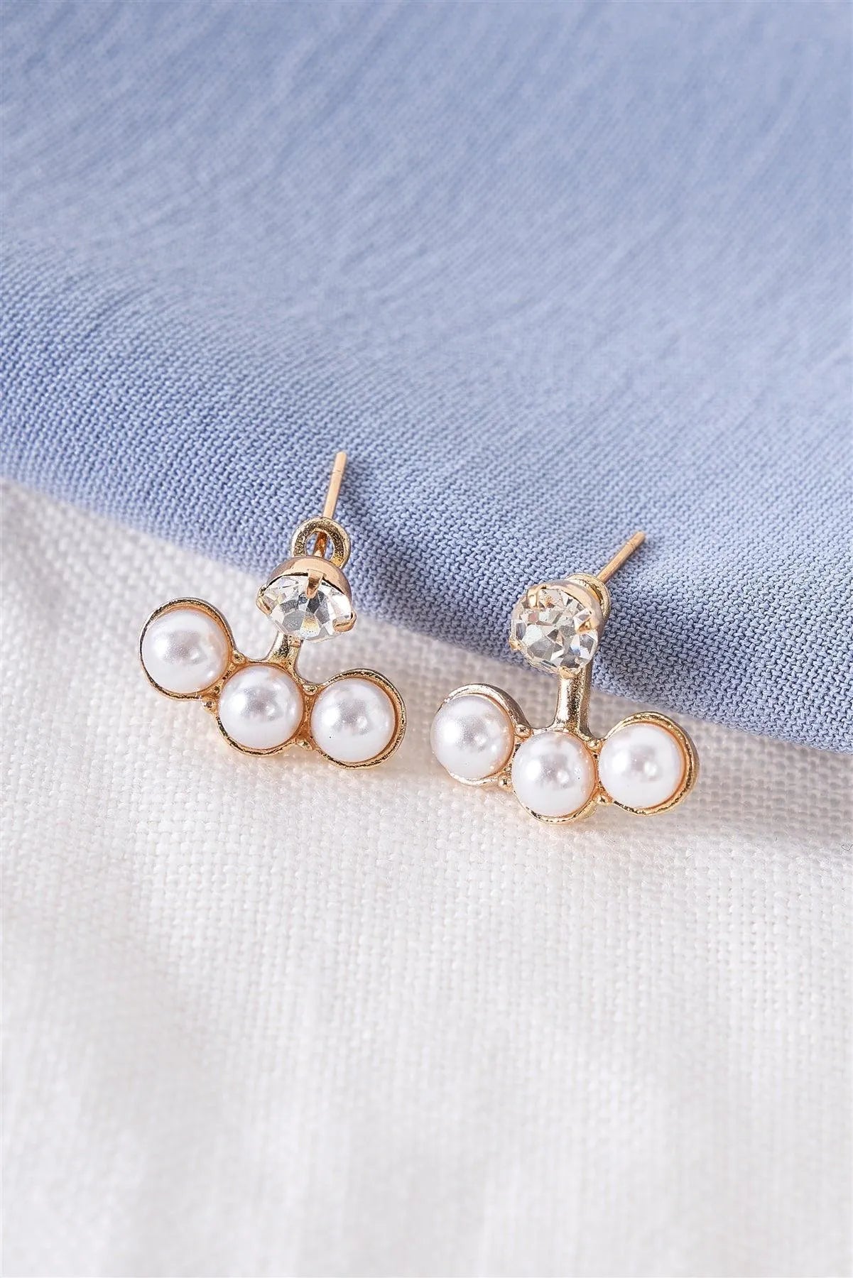 Front Back Gold Triple Pearl Faux Diamond Stud Earrings