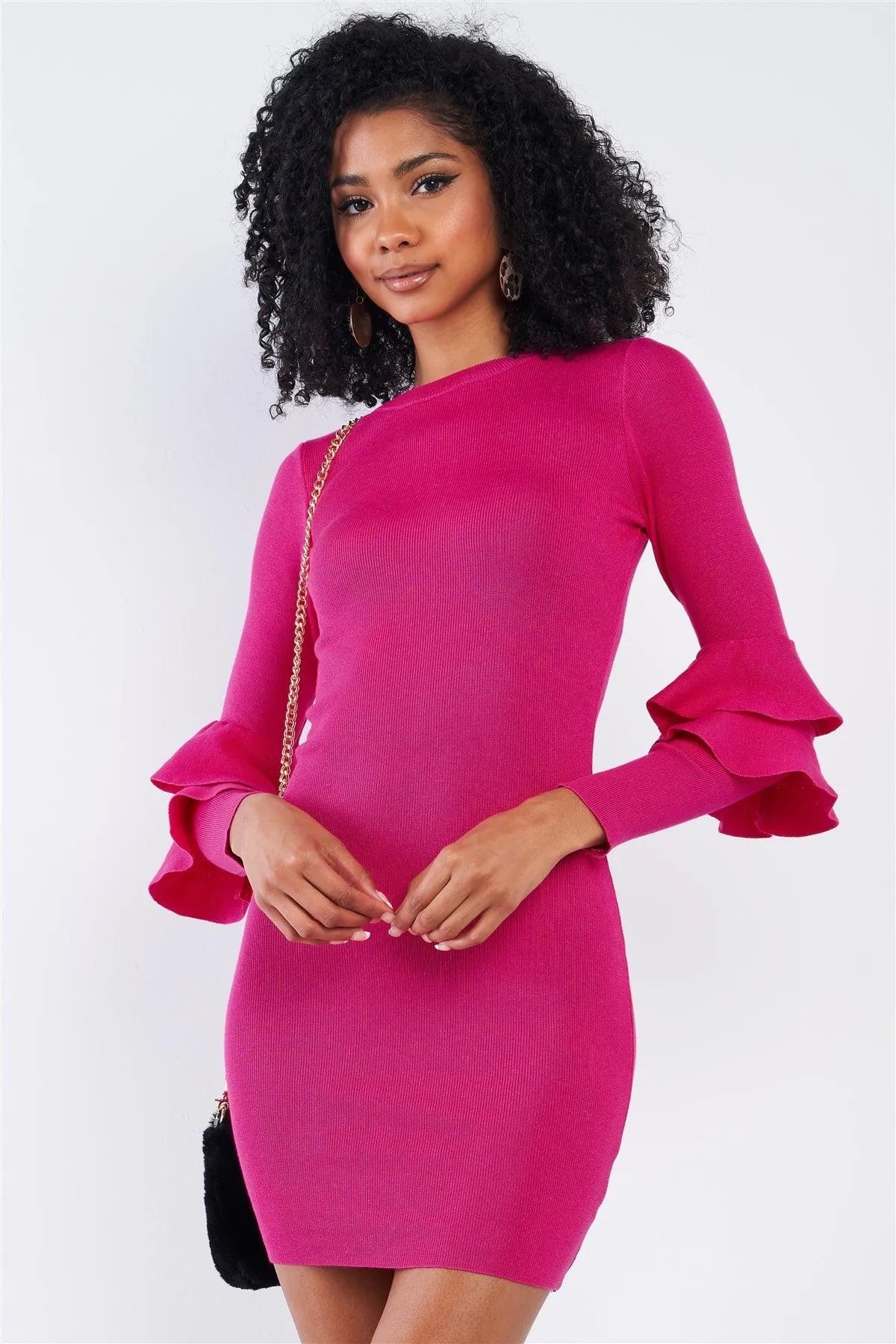 🖤 Item features: Solid, fuschia pink, tight fitting, unlined, round neckline, sweater type, long double frill detail sleeve, mini length, unlined, fall/winter wear, casual, warm, comfortable, breathable.