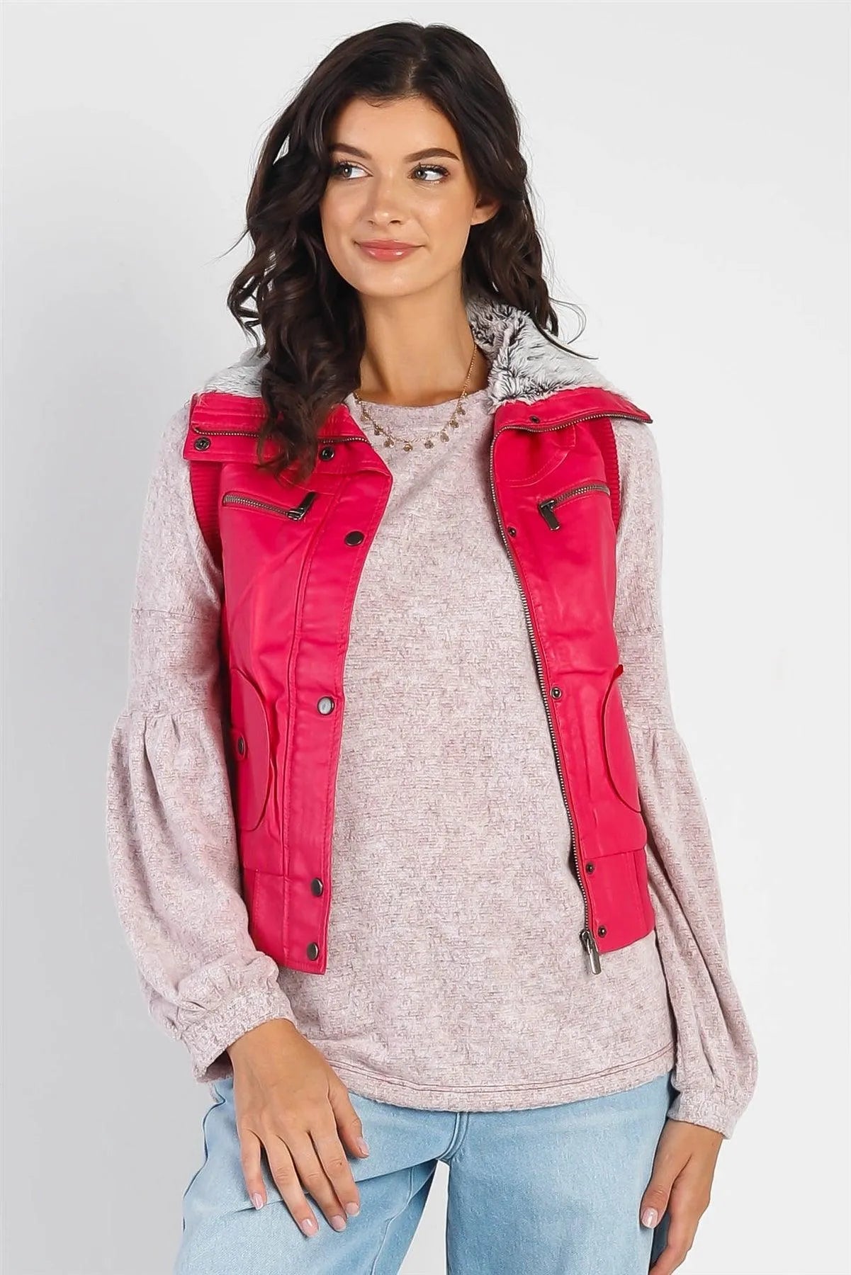 Vest features: zippered front with snap-button placket, front slit pockets with snap button, zippered front pockets, faux fur lining, ribbed trimModel is 5'9 wearing a size Small ( Waist: 26", Bust: 34C, Hips: 36")Small Size Item Measurements: Length: 21", Bust: 32"True to sizeAvailable in Mustard