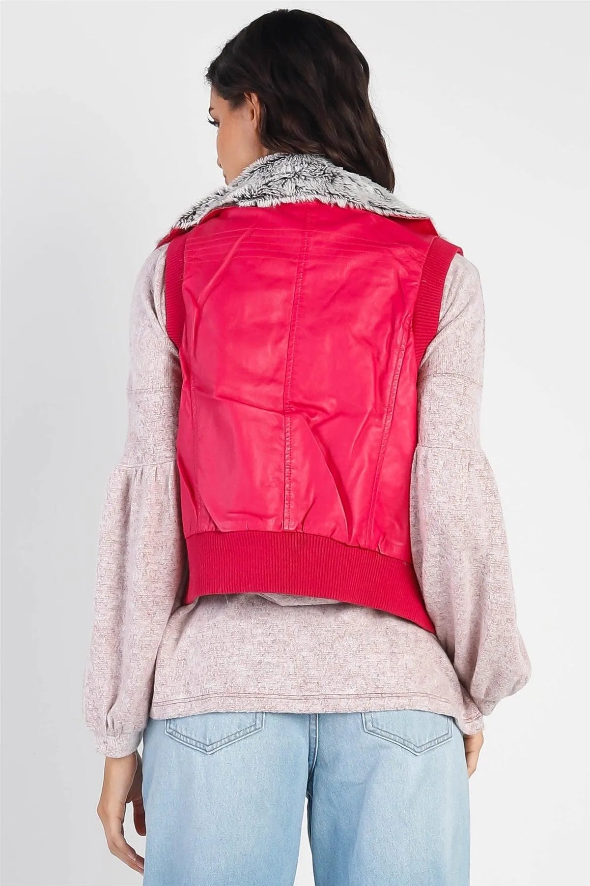 Fuchsia Vegan Leather Funnel Neck Faux Fur Lining Zip-Up Vest /2-2-2