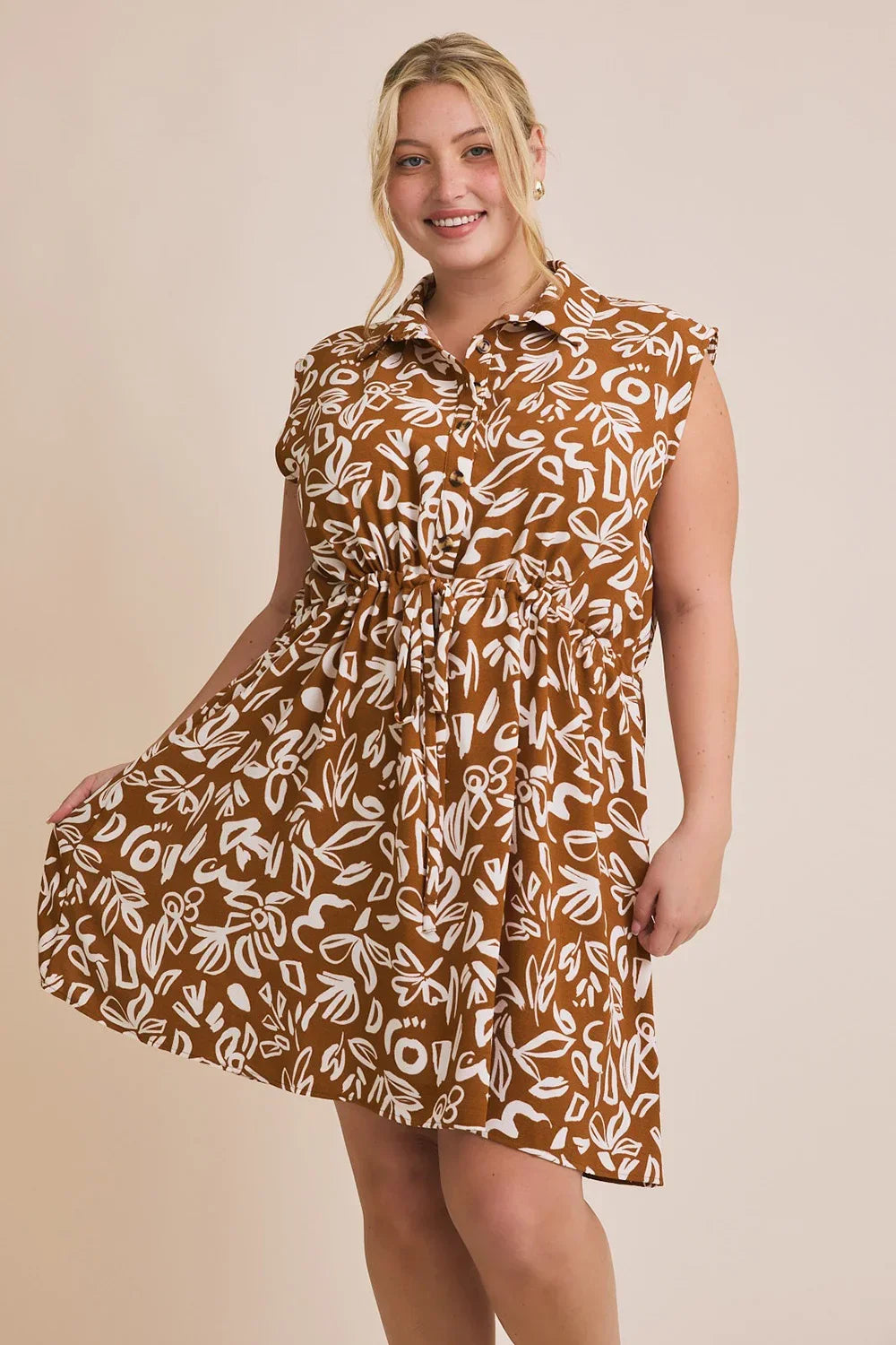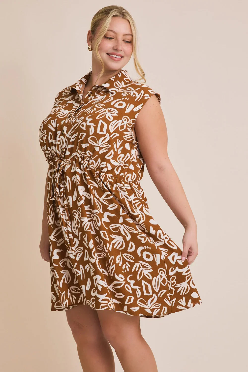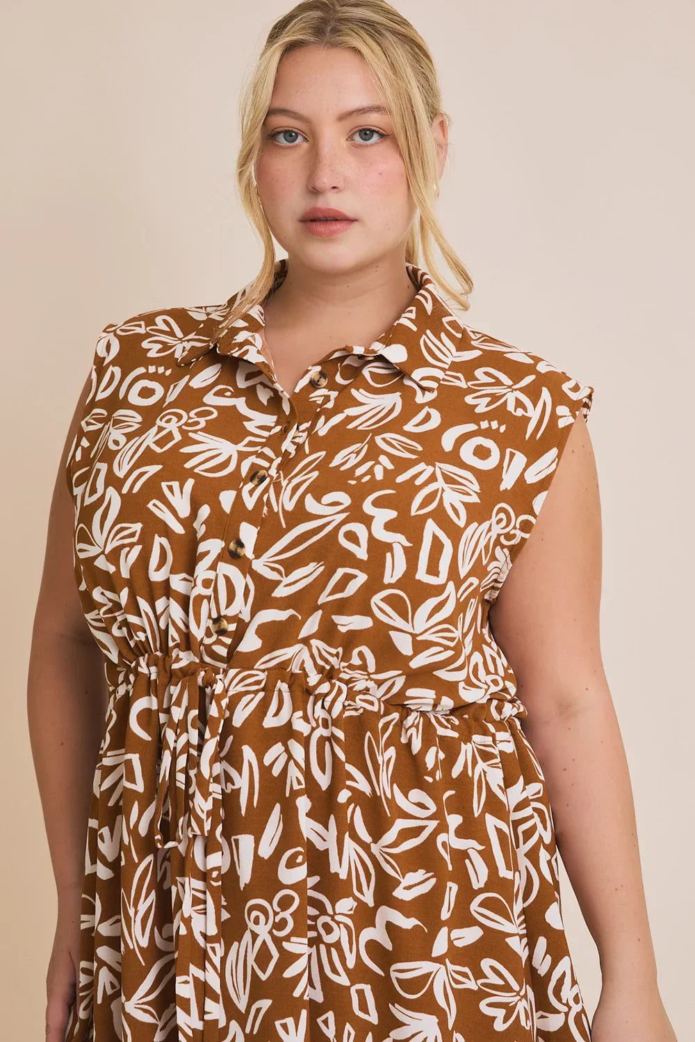 Plus Size Abstract Floral Print Collared Sleeveless Boho Caramel Summer Dress