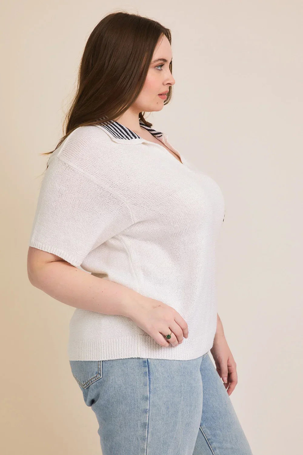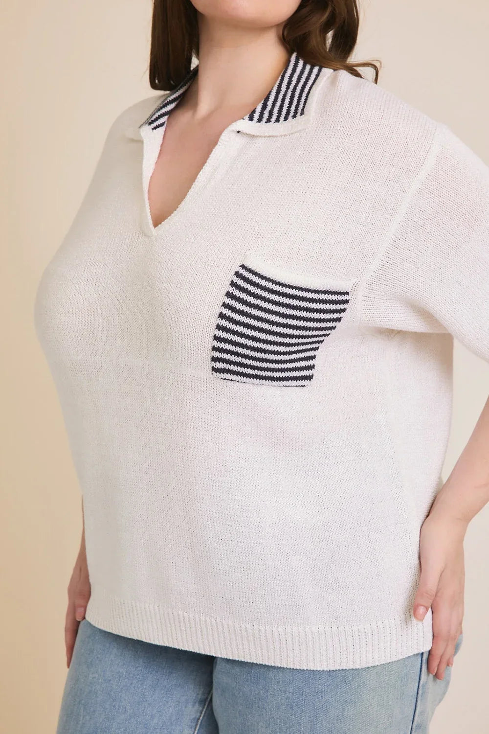 Delightfully preppy and effortlessly chic, our Plus Size Striped Collar Knit Top is the versatile piece your boutique customers will reach for all season long! This stylish white sweater top features a flattering v-neckline with a distinctive striped collar and matching pocket detail that adds a touch of retro-inspired elegance. Crafted from premium lightweight knit, this versatile plus size top combines timeless design with exceptional comfort that fashion-forward women are actively seeking for their spring and summer collections.