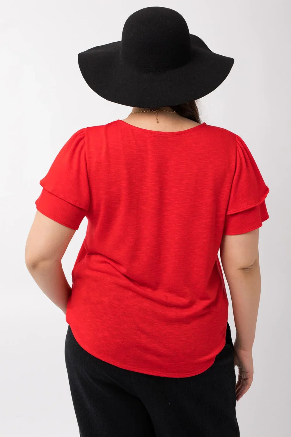 🖤 Features: Vibrant red color, Soft stretchy fabric, Flattering flutter sleeves, Layered sleeve design, Comfortable round neckline, Relaxed fit through body, Size-inclusive styling, Versatile wardrobe staple, Ready to ship, Easy care, Bold yet timeless, Perfect for all seasons