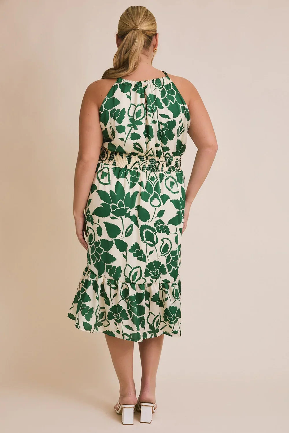 🖤 Features: Premium lightweight fabric, Bold emerald green and white color palette, Striking botanical print, Elegant halter neckline, Comfortable sleeveless design, Flattering smocked waist, Beautiful tiered hem detail, Size-inclusive styling, Easy-care material, Ready to ship, Perfect midi length, Ideal for warm weather