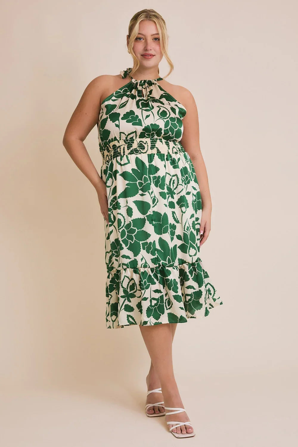 Absolutely stunning and refreshingly elegant, our Plus Size Floral Print Midi Dress is the statement piece your boutique customers will be falling in love with this season! This eye-catching emerald green dress features a sophisticated halter neckline and flattering smocked waist that creates a beautifully feminine silhouette. Crafted from lightweight flowy fabric, this versatile plus size dress combines bold botanical prints with practical comfort that fashion-forward women are actively seeking for their spring and summer wardrobes.