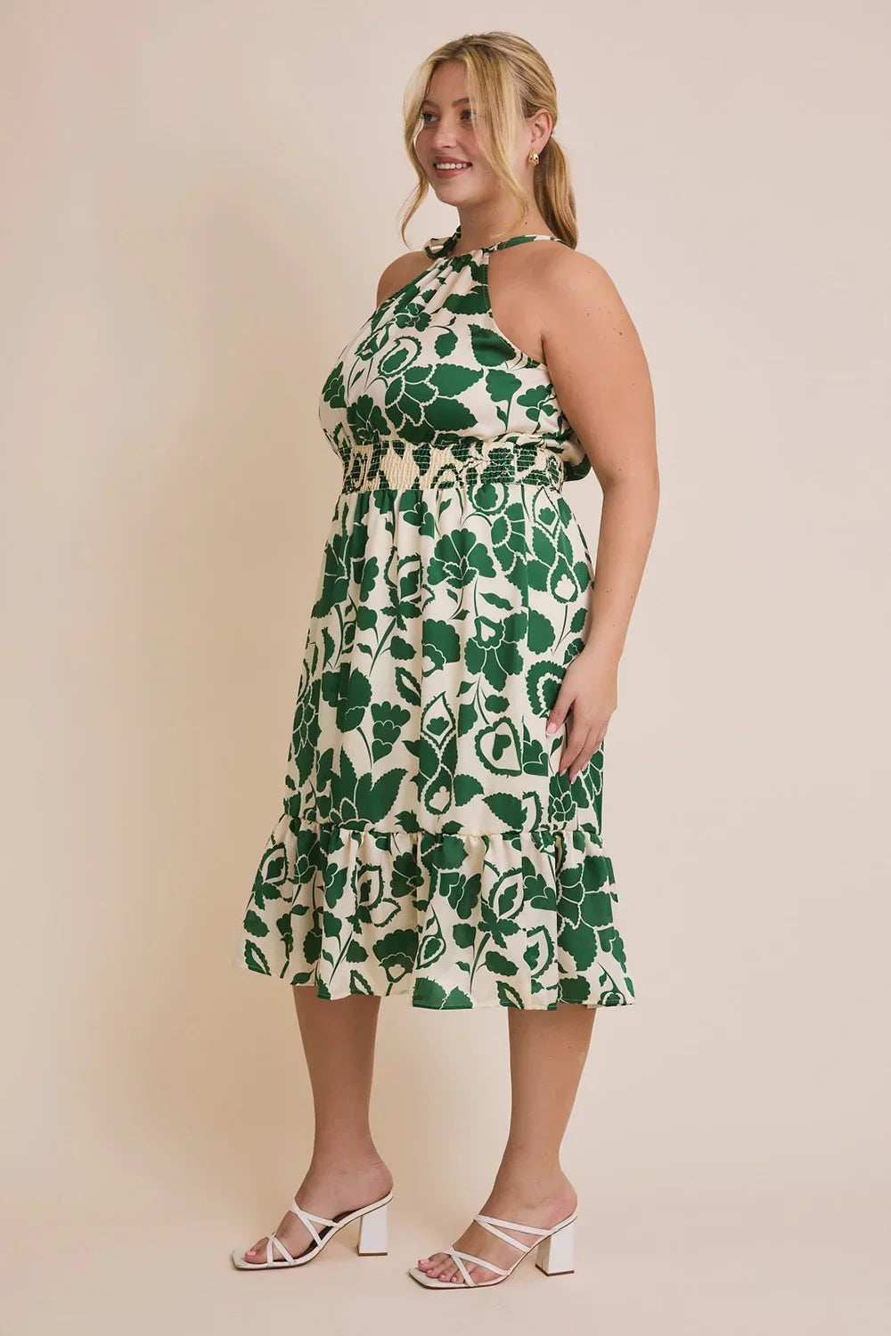 Plus Size Halter Neck Floral Print Smocked Waist Midi Dress