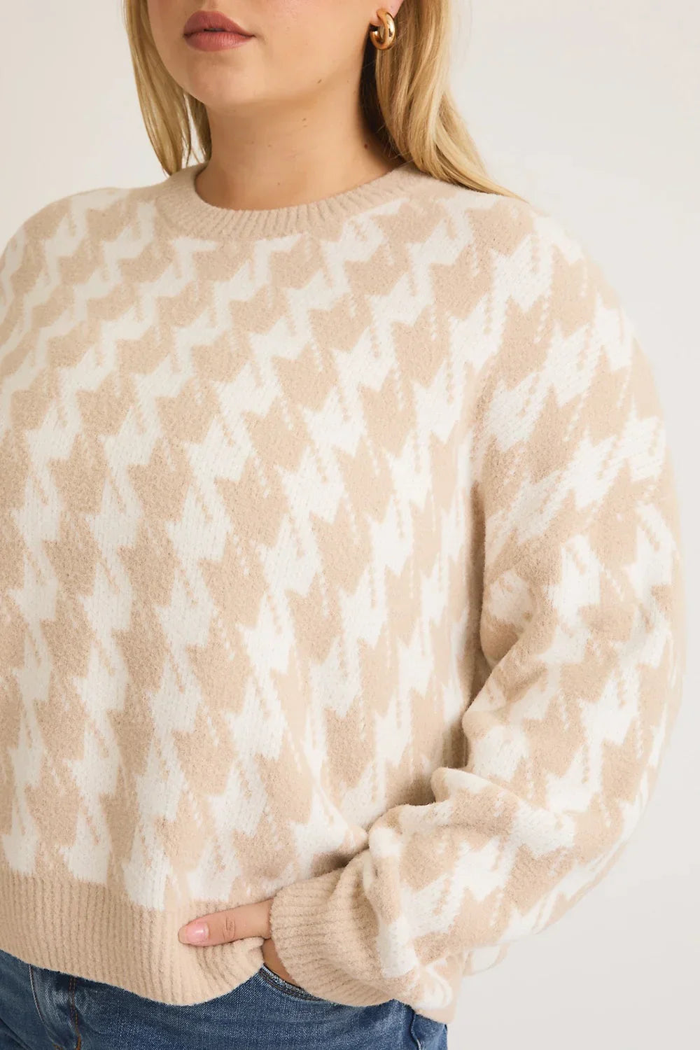 🖤 Features: Premium soft knit fabric, Classic houndstooth pattern, Elegant beige and white color palette, Comfortable crewneck design, Relaxed fit through body, Ribbed trim detailing, Size-inclusive styling, Versatile wardrobe staple, Ready to ship, Easy care, Timeless neutral tones, Perfect for fall and winter