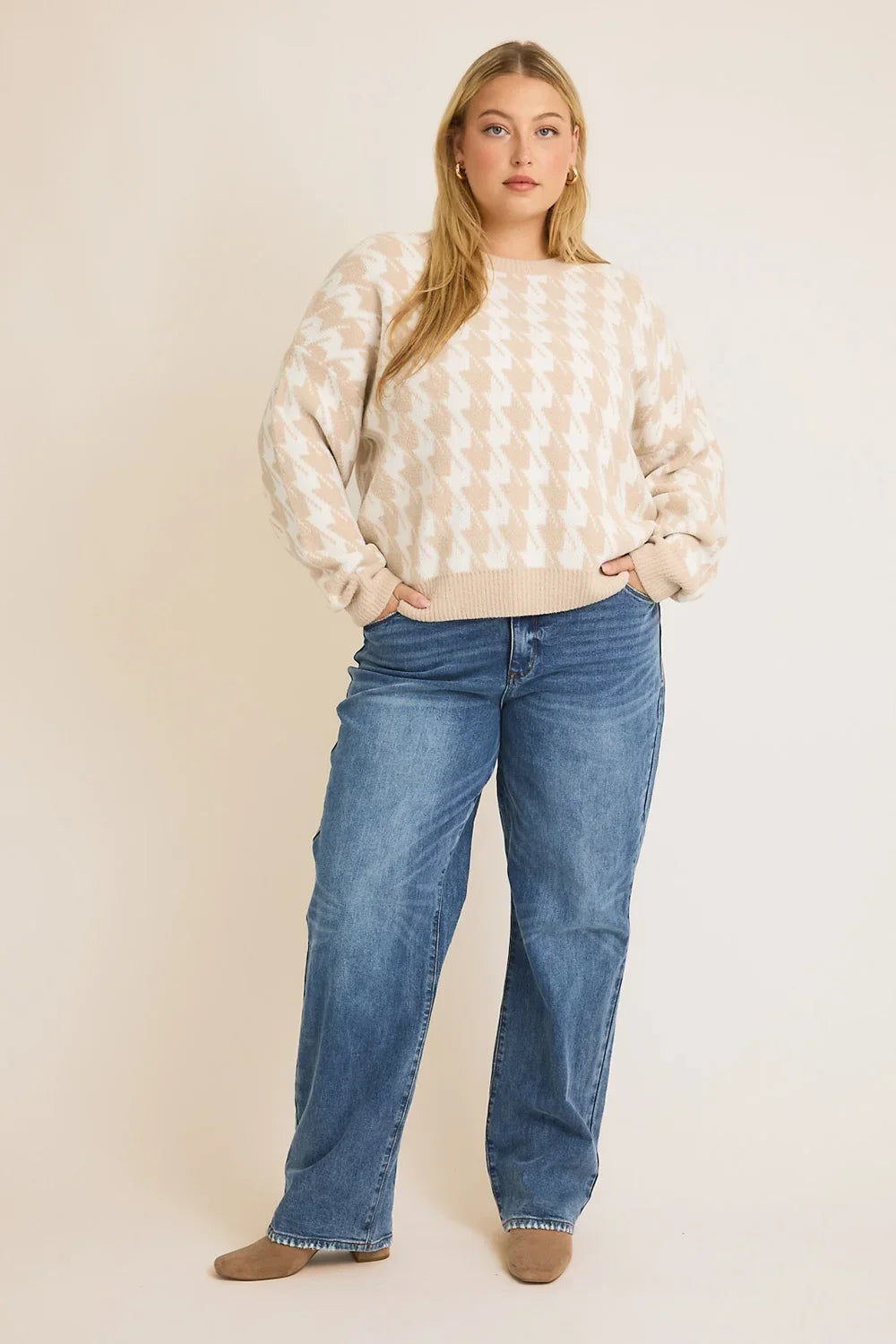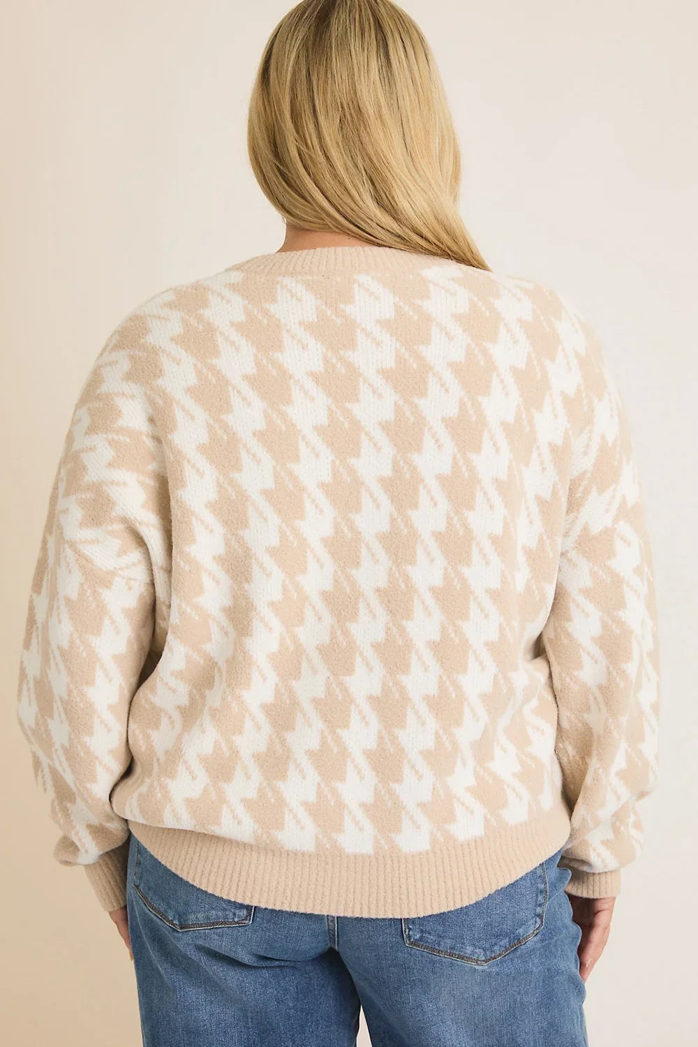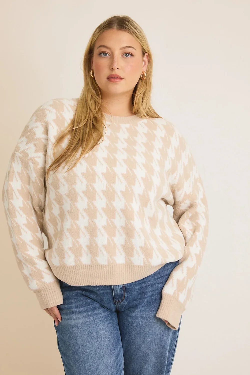 Utterly chic and beautifully versatile, our Plus Size Houndstooth Sweater is the luxury basic your boutique customers will reach for again and again this season! This stylish beige and white sweater features a classic houndstooth pattern in sophisticated neutral tones that perfectly balance trendy and timeless appeal. Crafted from premium soft knit, this cozy plus size sweater combines elegant design with exceptional comfort that fashion-forward women are actively seeking for their fall and winter collections.