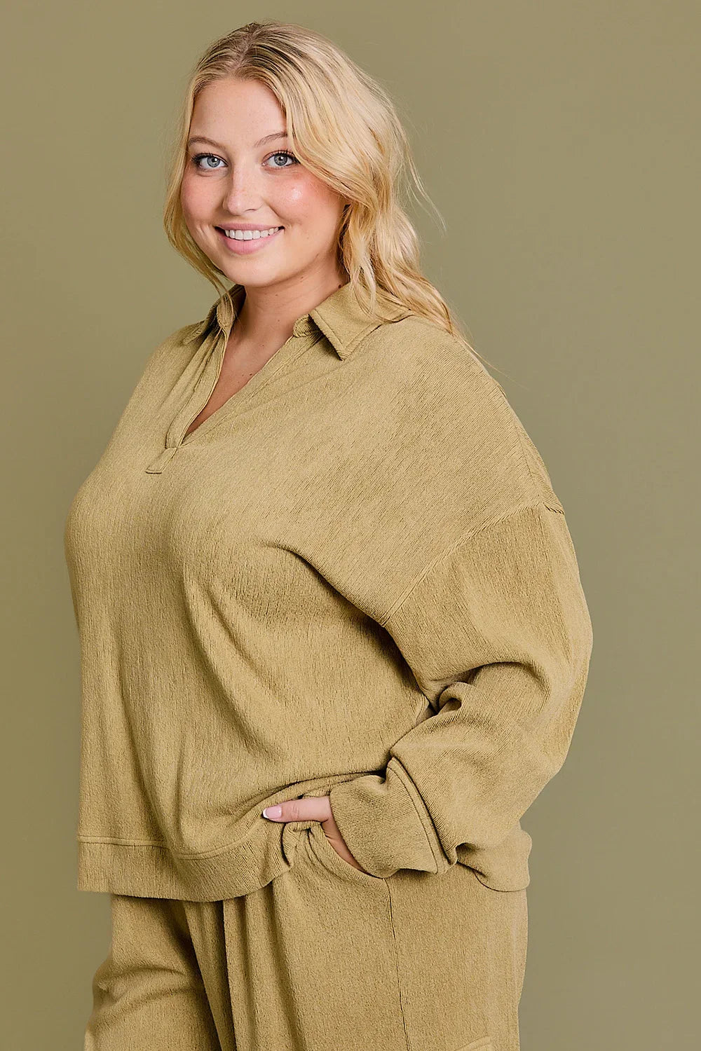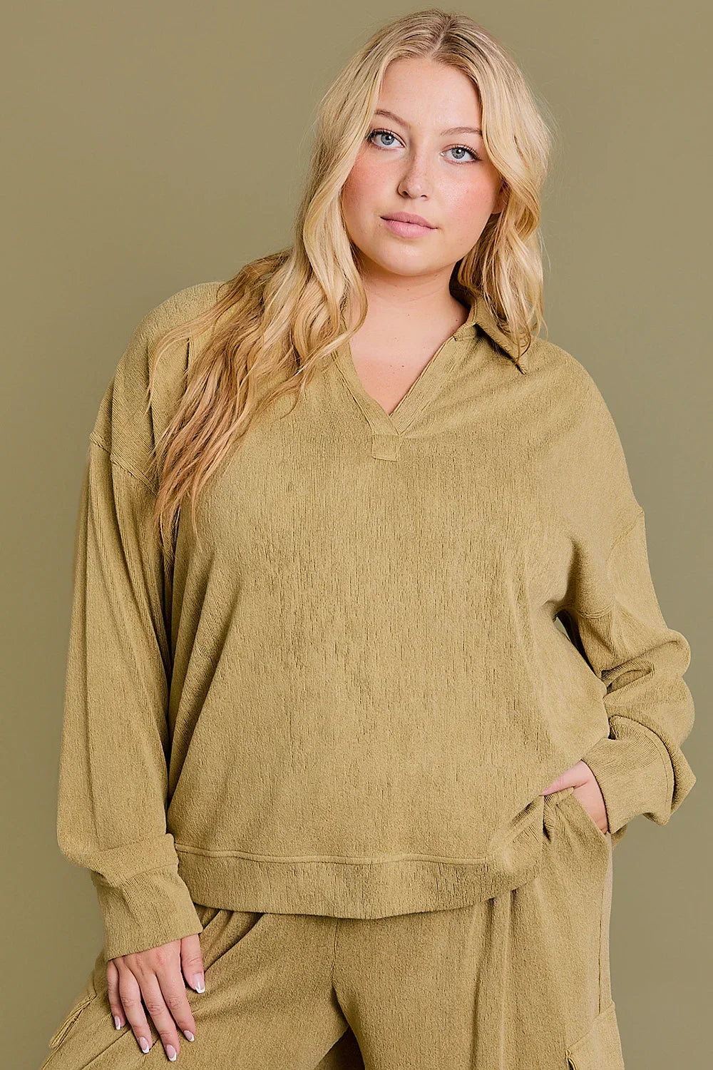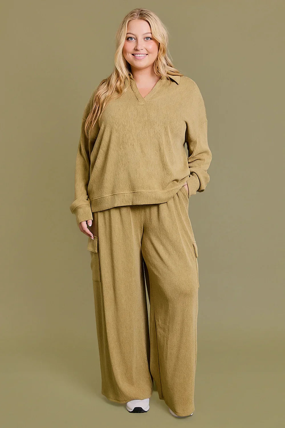 Stay comfortably chic with our Plus Size Olive Green V-Neck Matching Set. This luxurious lounge-inspired plus size wholesale boutique set features a cozy v-neck pullover and wide-leg cargo pants in a gorgeous olive green hue that's perfect for elevated comfort wear. Perfect for boutique owners seeking trendy plus size athleisure fashion that appeals to customers who love coordinated comfort sets, this versatile matching set brings effortless style and all-day comfort together beautifully.