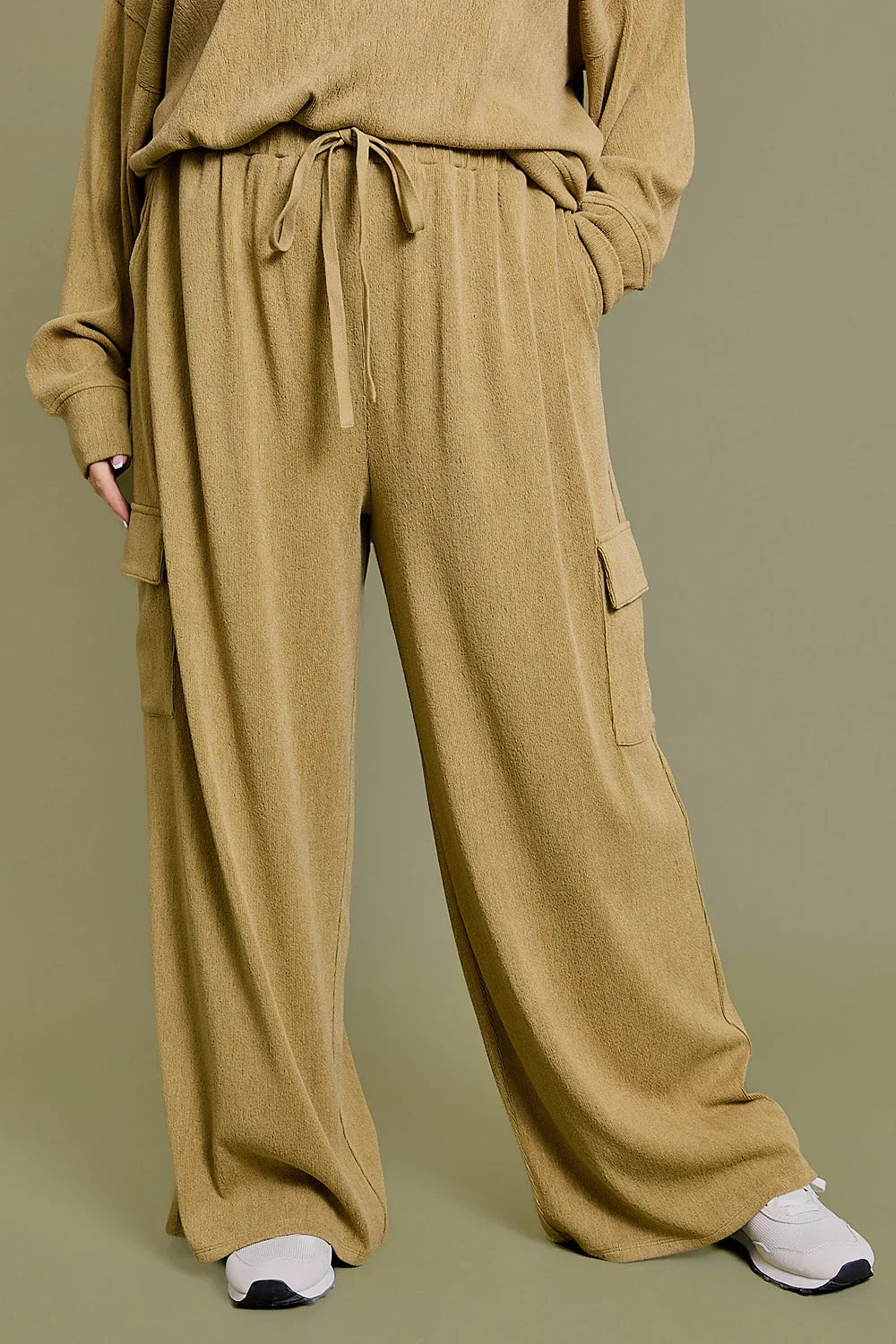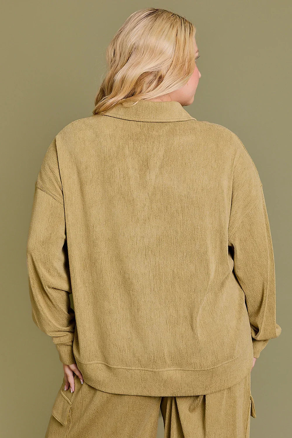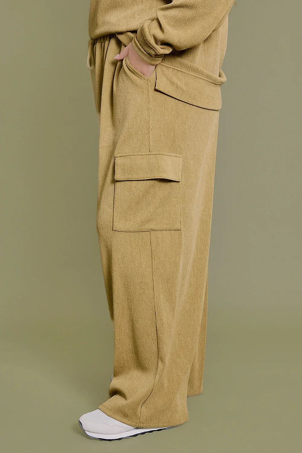 Stay comfortably chic with our Plus Size Olive Green V-Neck Matching Set. This luxurious lounge-inspired plus size wholesale boutique set features a cozy v-neck pullover and wide-leg cargo pants in a gorgeous olive green hue that's perfect for elevated comfort wear. Perfect for boutique owners seeking trendy plus size athleisure fashion that appeals to customers who love coordinated comfort sets, this versatile matching set brings effortless style and all-day comfort together beautifully.