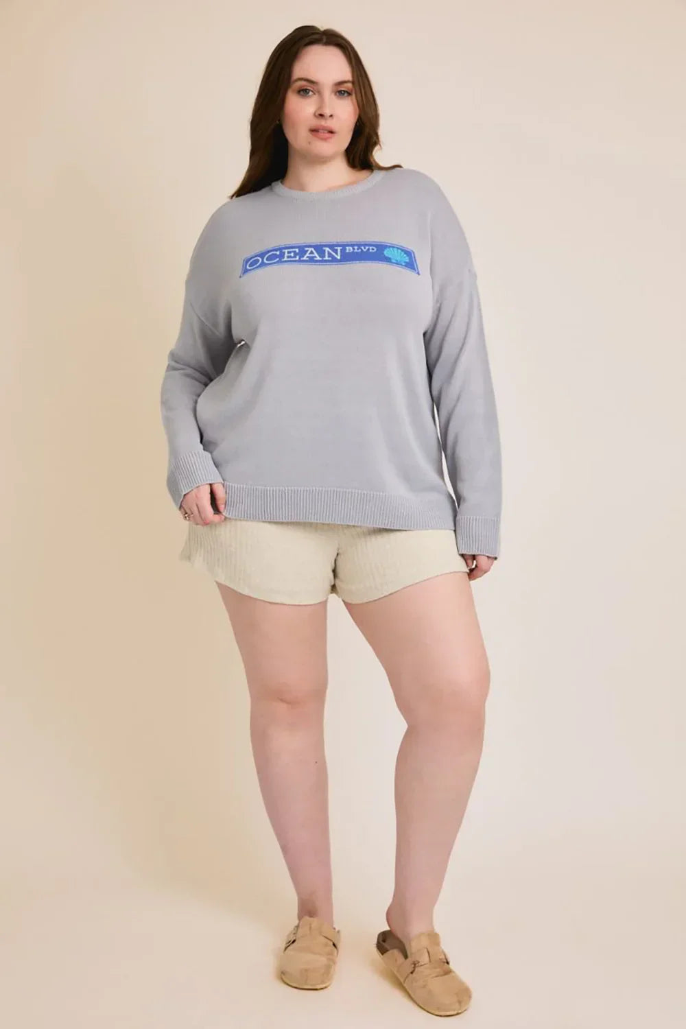Stay cozy and coastal with our Plus Size Ocean BLVD Graphic Sweater. This adorable boutique knit top features a charming blue "Ocean BLVD" graphic with seashell detail against soft grey knit fabric, designed with long sleeves and a comfortable crew neckline. Perfect for your plus size boutique customers, this coastal grandmother sweater captures that coveted beachy-chic aesthetic that's trending everywhere from TikTok to Pinterest.
