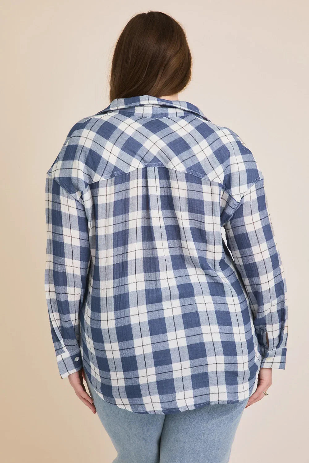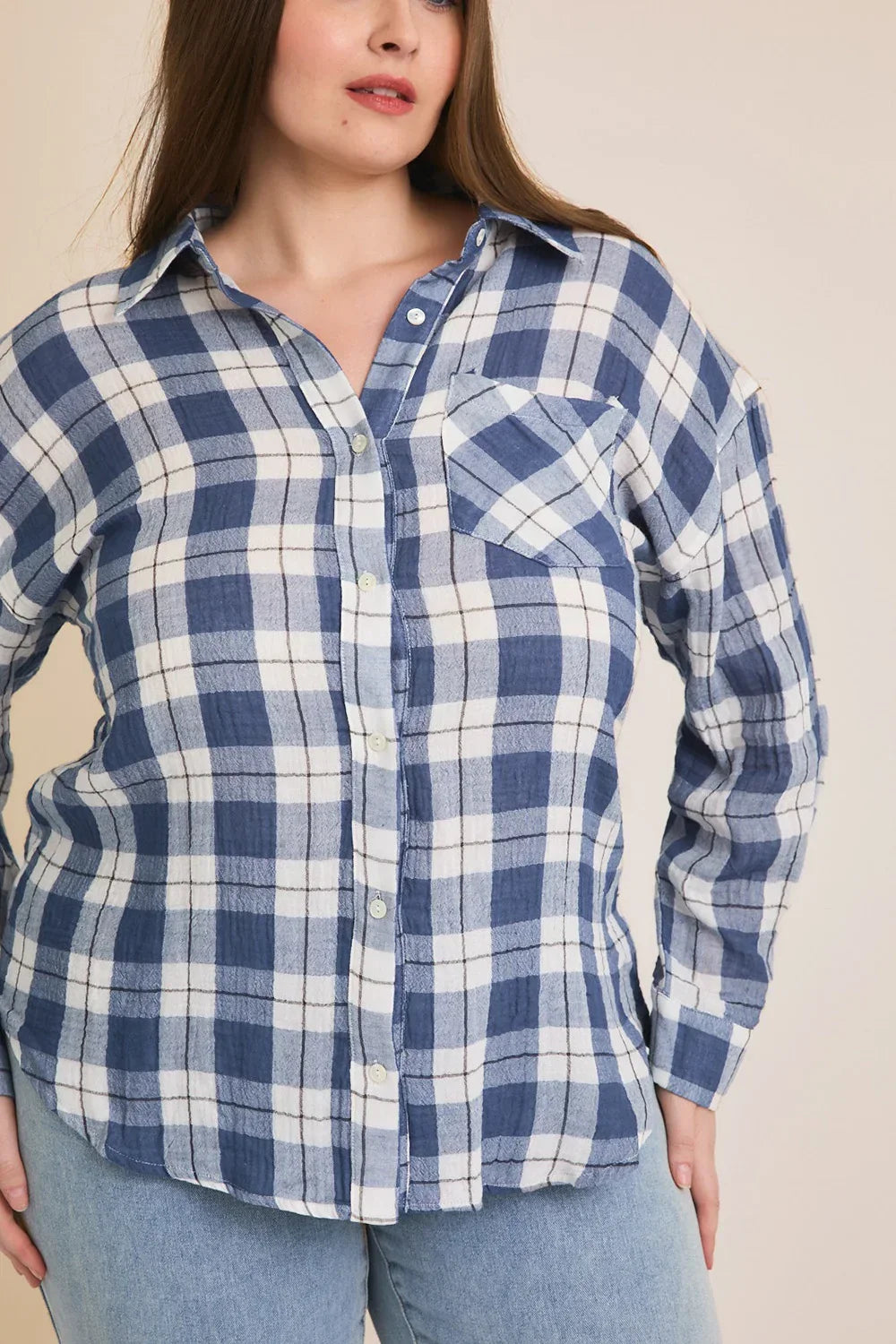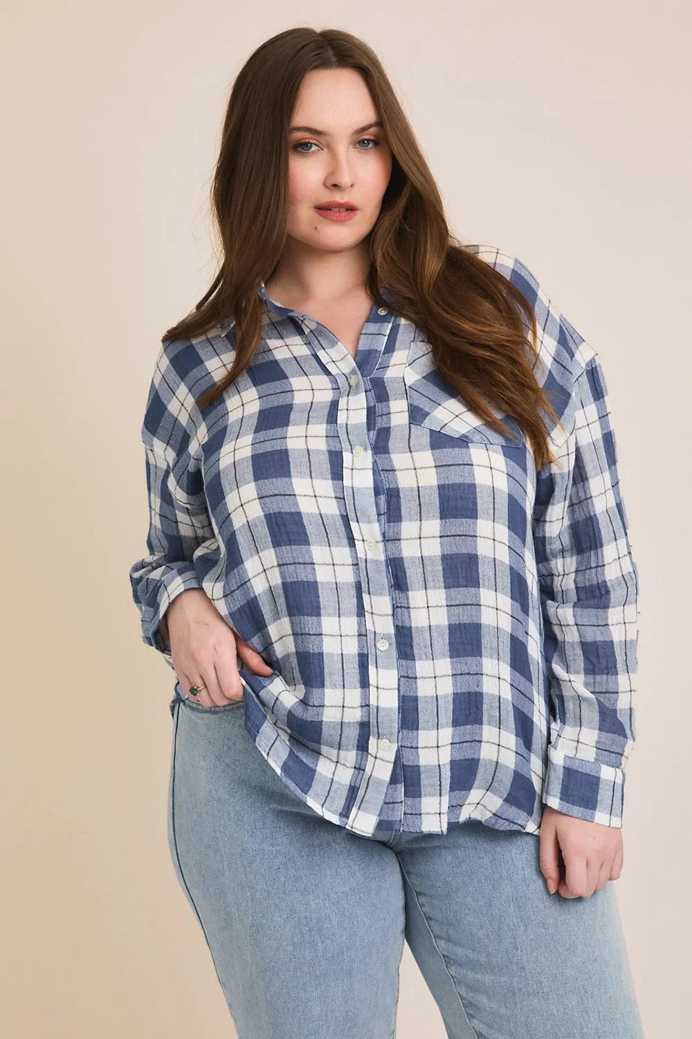 Plus Size Cotton Plaid Button Down Long Sleeve Lightweight Shirt