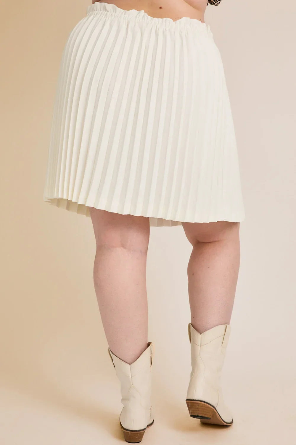 🖤 Features: Premium lightweight fabric, Classic crisp white color, Feminine accordion pleats, Comfortable elastic waistband, Adjustable drawstring detail, Ruffle trim waist, Built-in shorts for coverage, Versatile mini length, Easy-care material, Ready to ship, Perfect for warm weather, Timeless preppy appeal