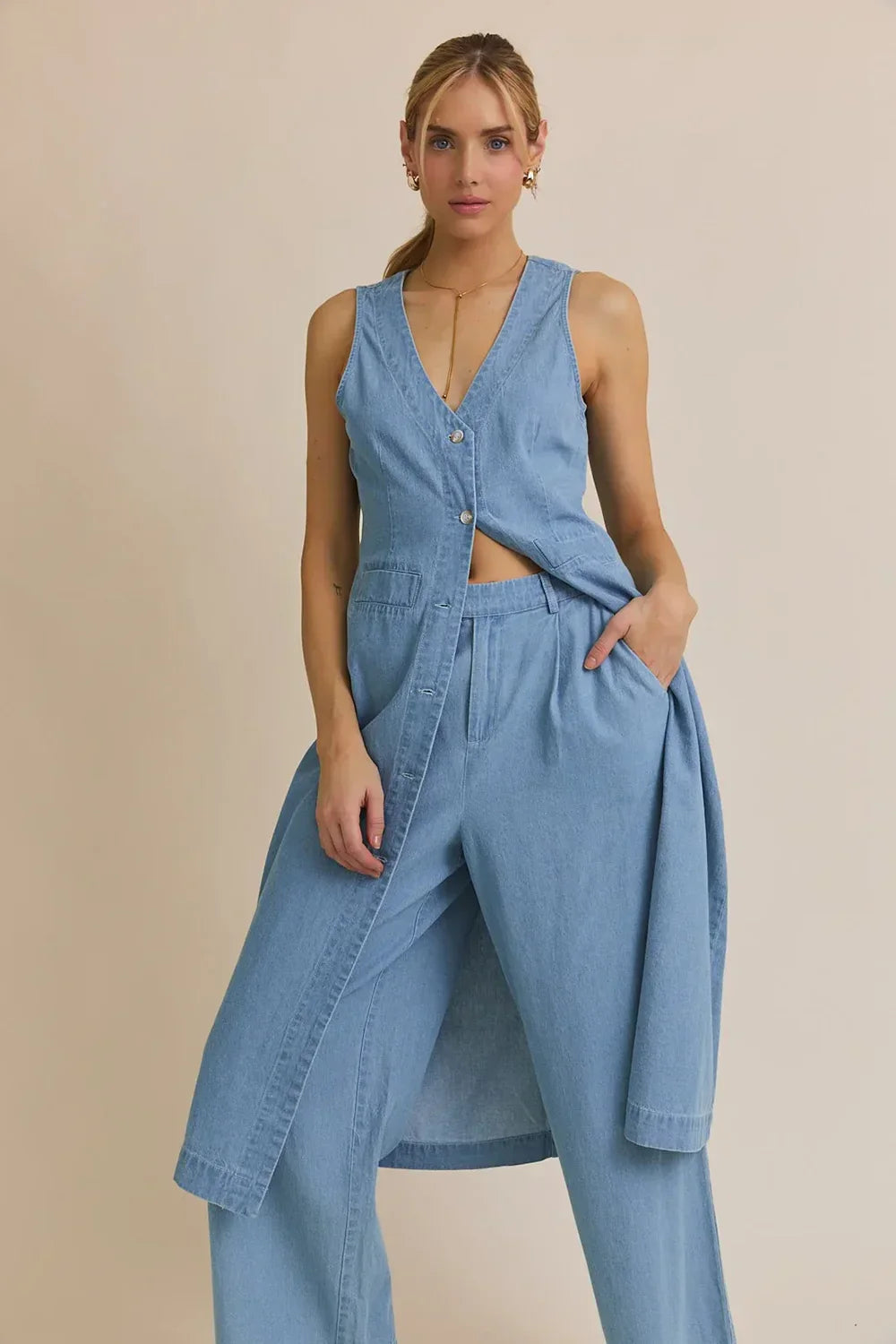 Refresh your boutique's denim collection with our chic Denim Button Front Sleeveless Vest that brings effortless cool to any wardrobe. This wholesale women's denim vest features a flattering deep V-neckline and classic button-front closure with convenient front pockets that boutique owners love for its versatile styling potential. Perfect for creating those laid-back luxe looks that confident women adore, this long tunic vest layers beautifully or stands alone as a statement piece.
