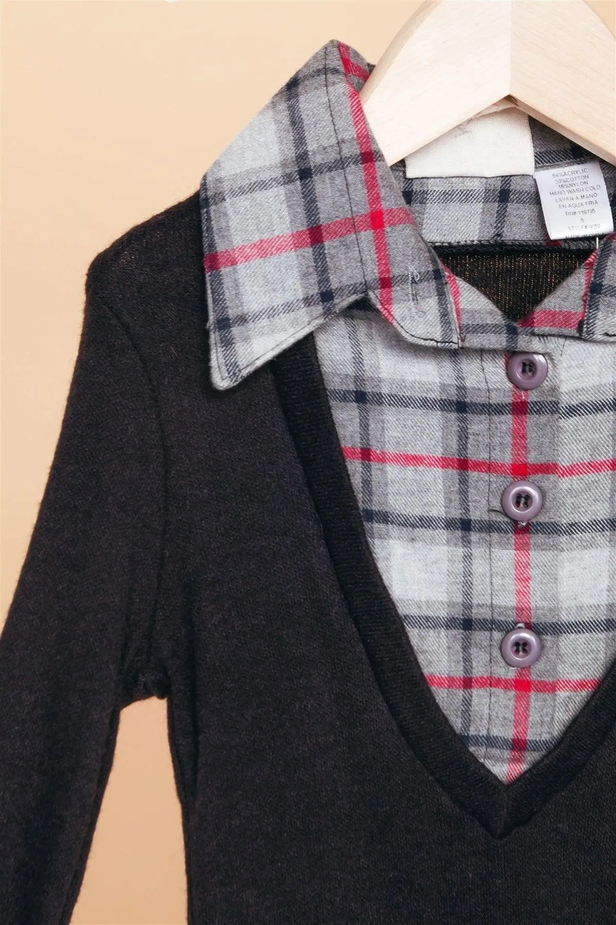 Elevate your little girl's style with our Black Charcoal Combo Plaid Sweater Dress. Crafted with a blend of warmth and comfort, this dress features a charming plaid design, perfect for any occasion. Keep her cozy and chic this season with our versatile sweater dress.