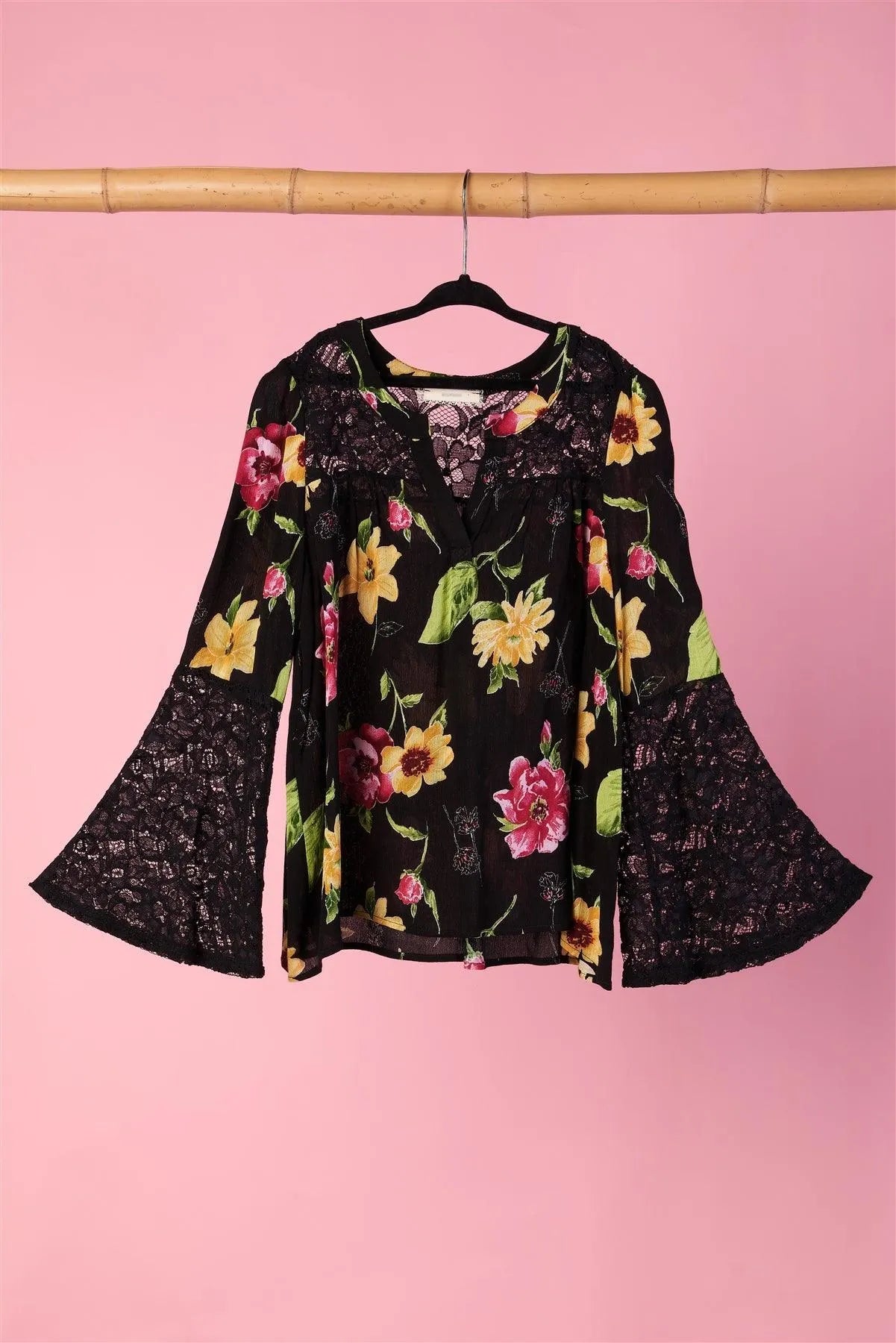 Top features: long floral lace bell sleeves, v-neck, lace detailing at neck and back, floral print allover, slightly sheerItem Measurements size Small (7/8): Length: 19", Bust: 32", Sleeves: 17"