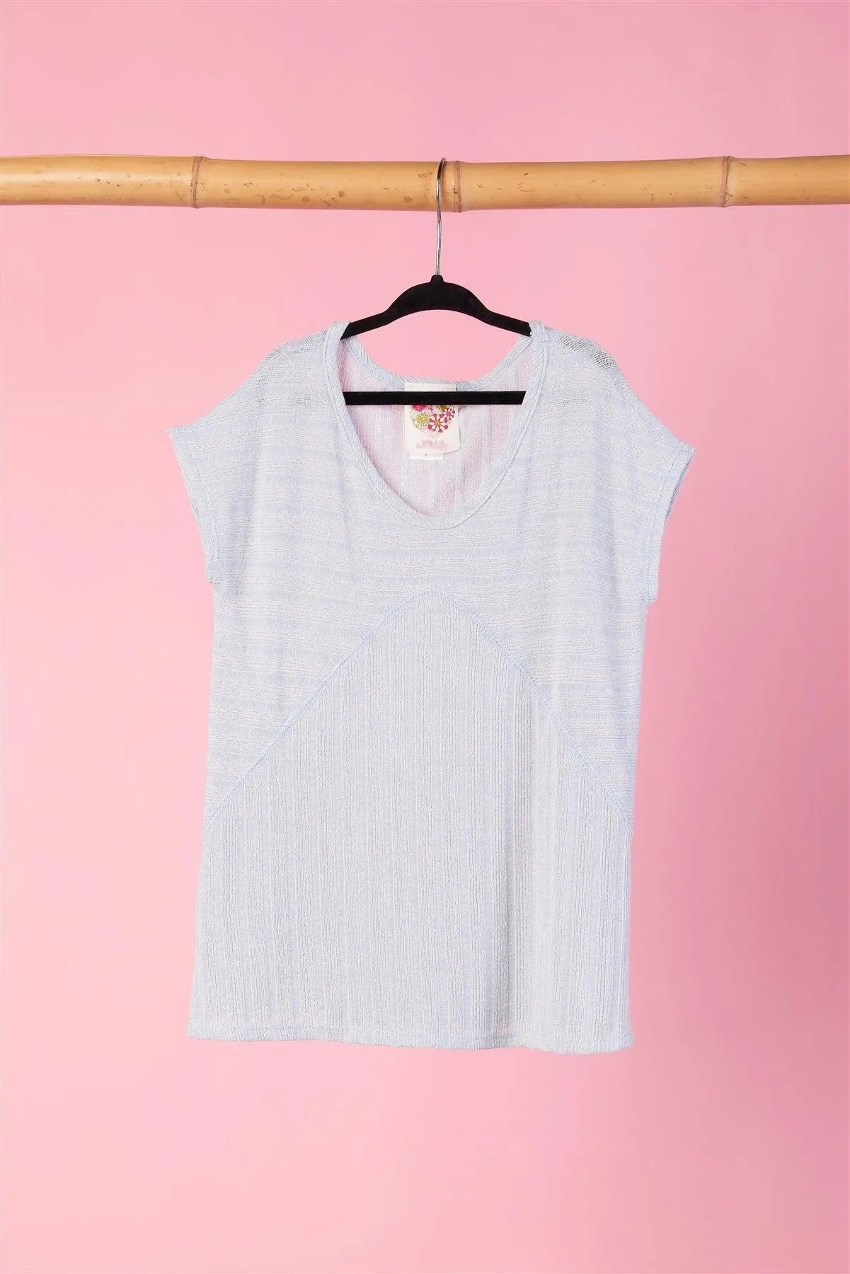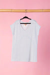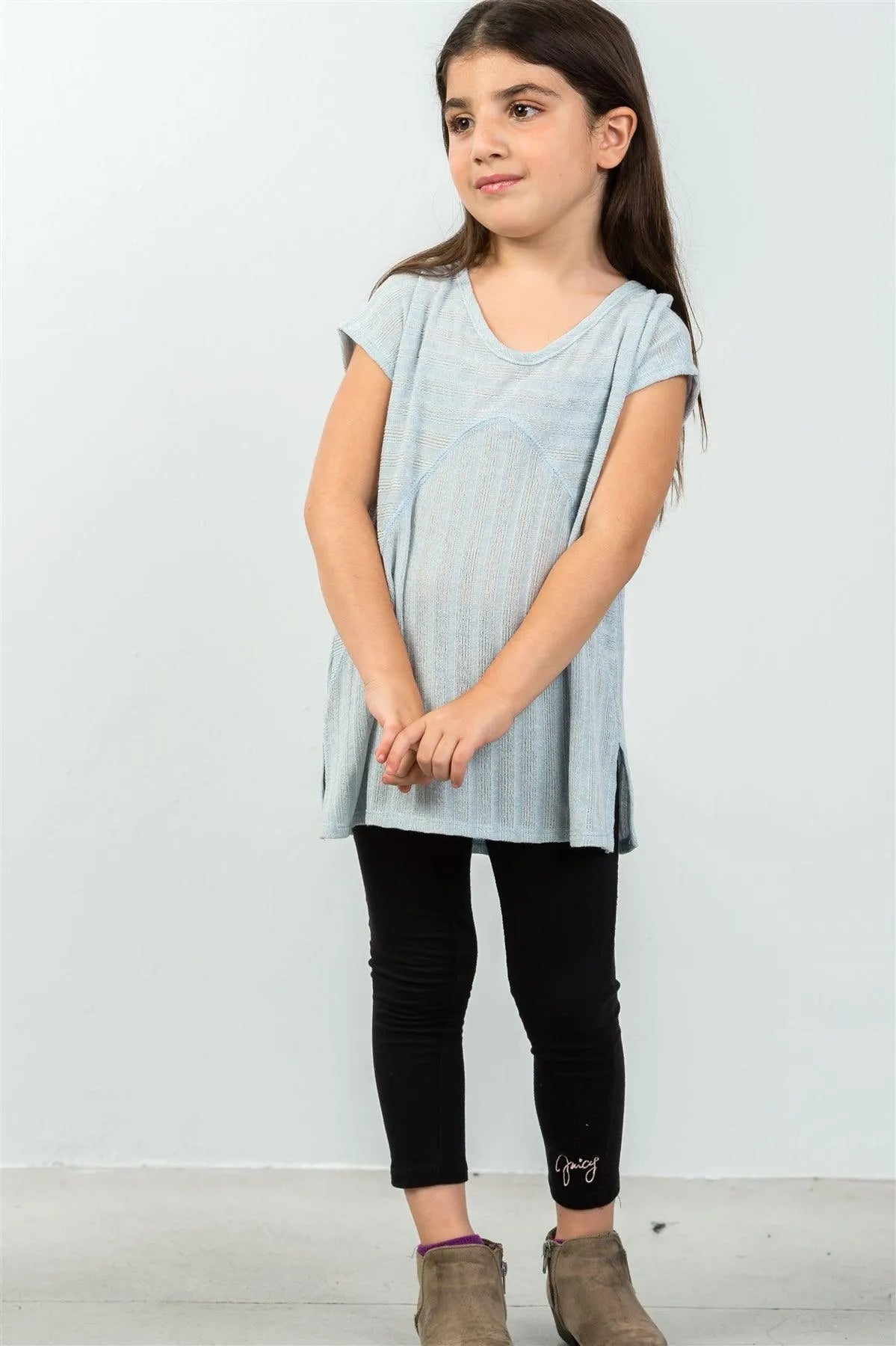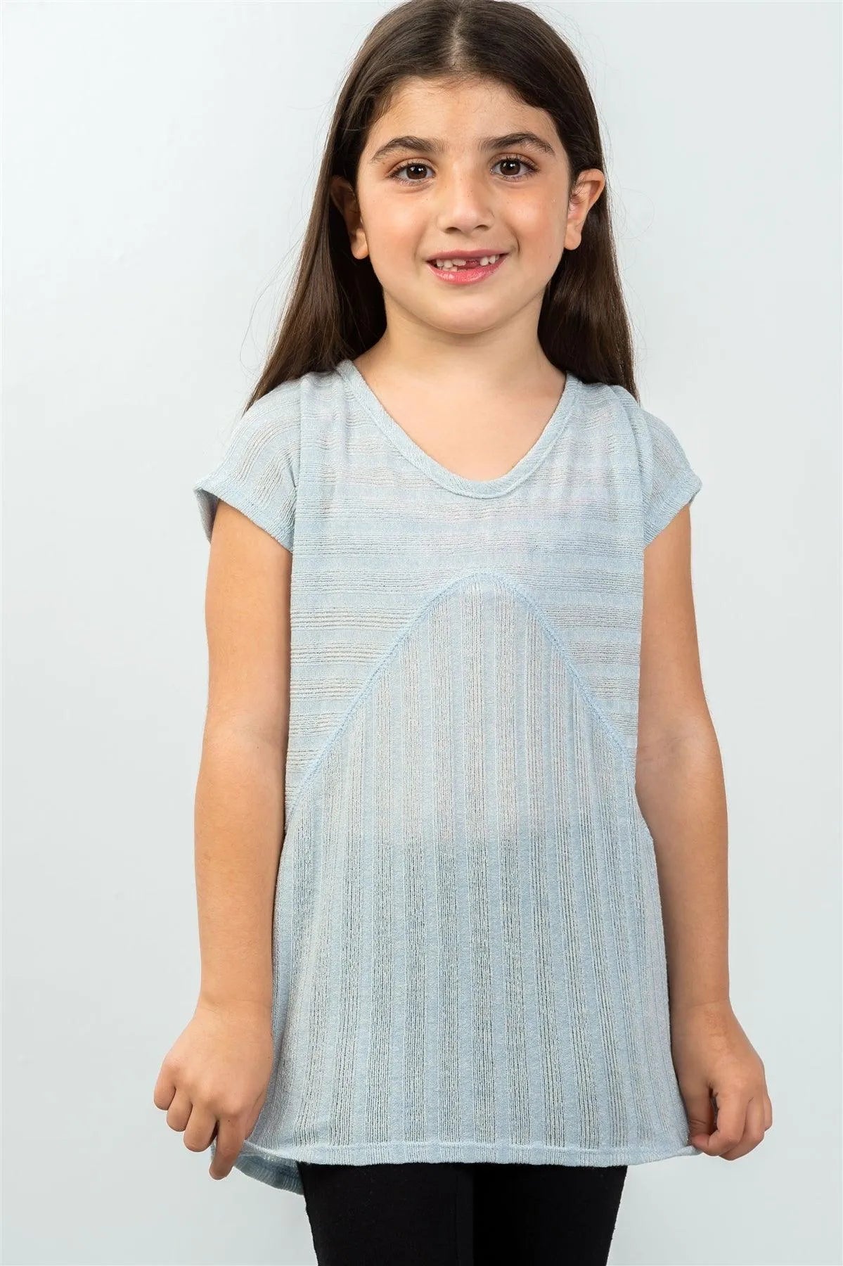 Girls top features: cap sleeves, slightly sheer, ribbed, round neckline, side slits, unlined. Model is 6 years old wearing size SmallSmall Size Item Measurements: Length: 21", Bust 30"