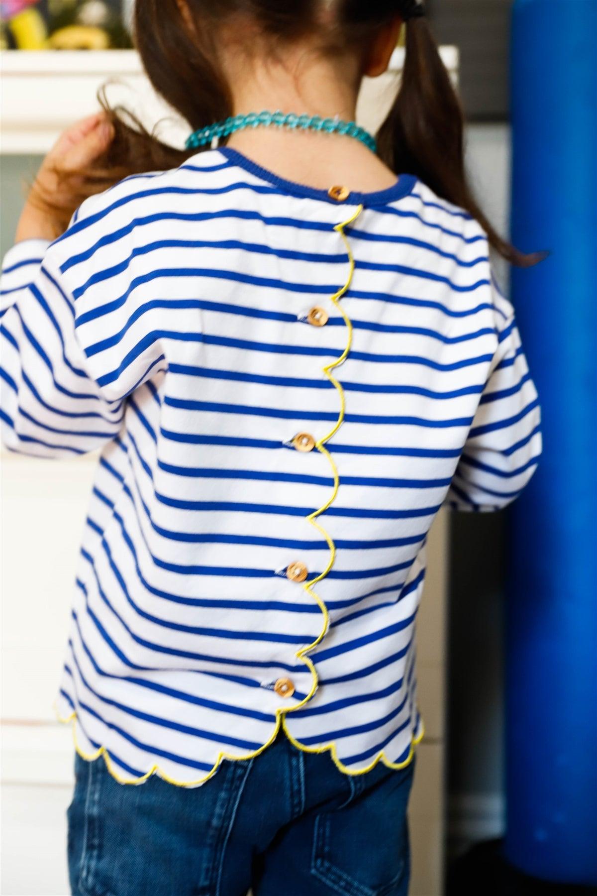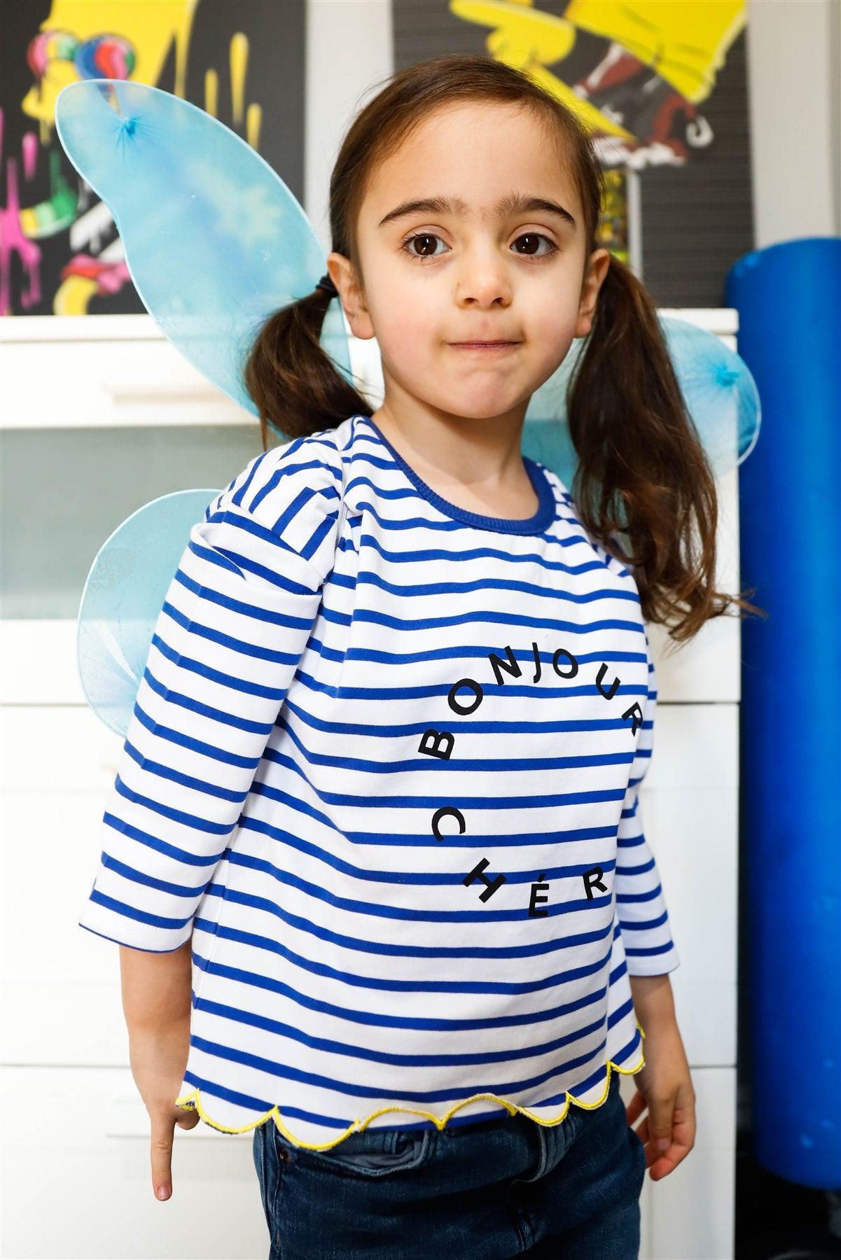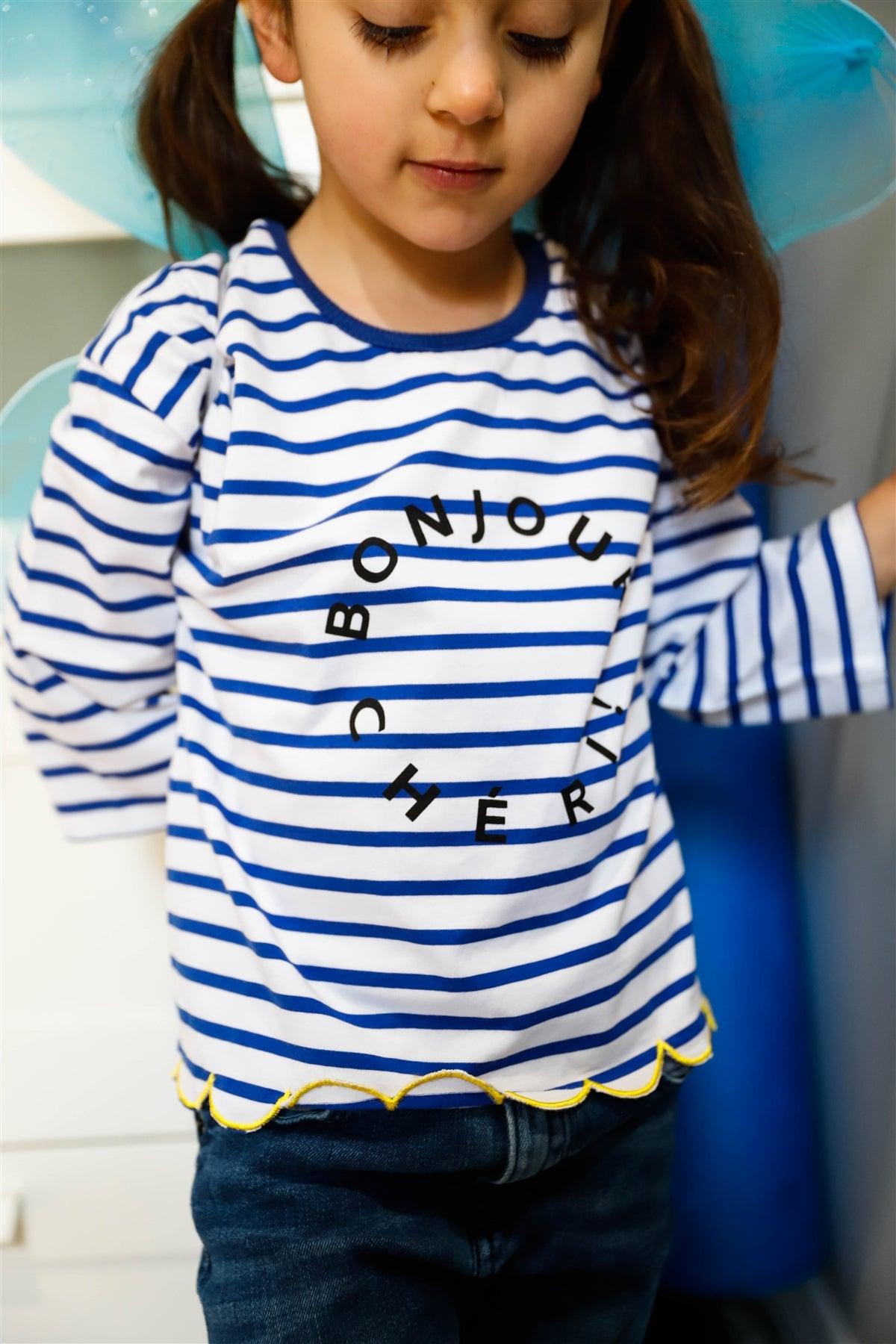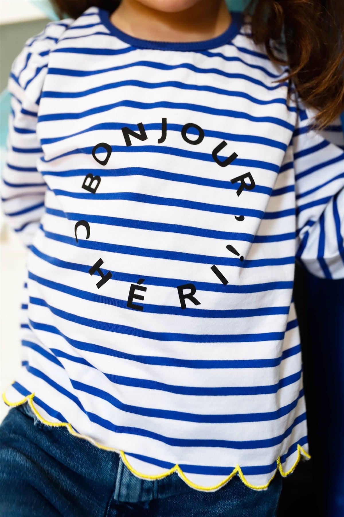 Toddler Girls Blue Stripe "Bonjour" Print Contrast Lettuce Edge Back Button Up Detail Top /1-3-2