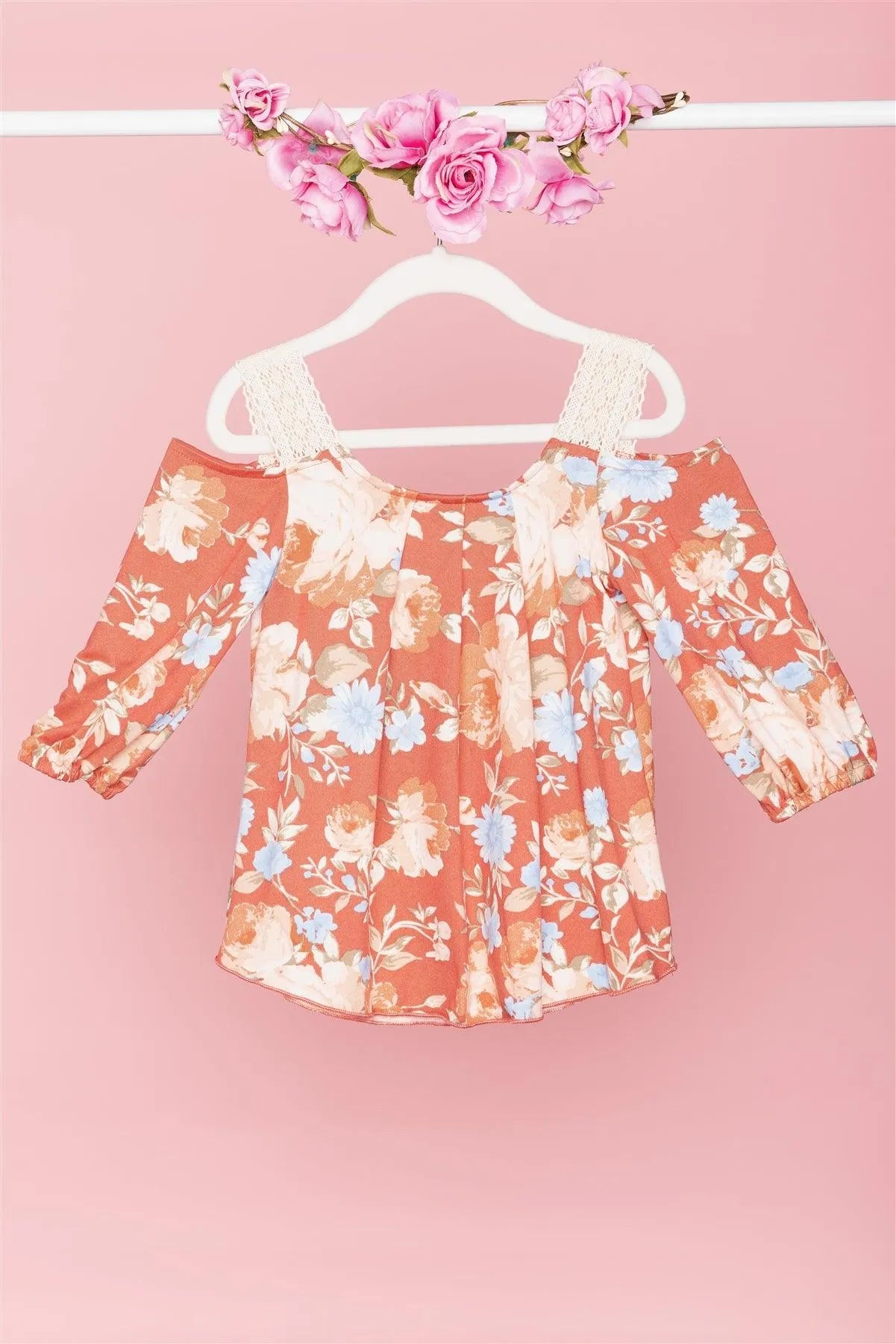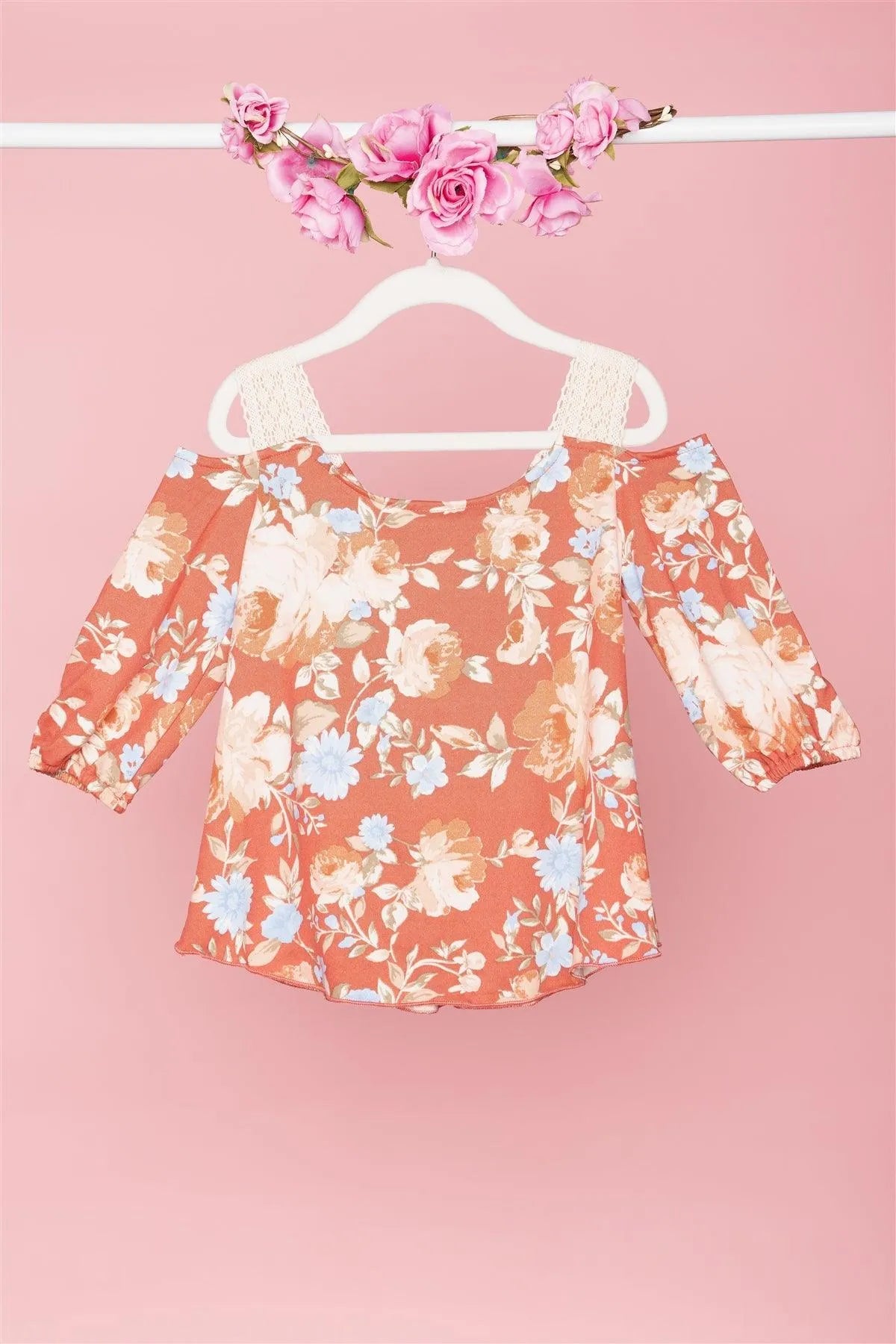 Toddler Girls Boho Floral Rust Cold Shoulder Crochet Detail Top /3-1