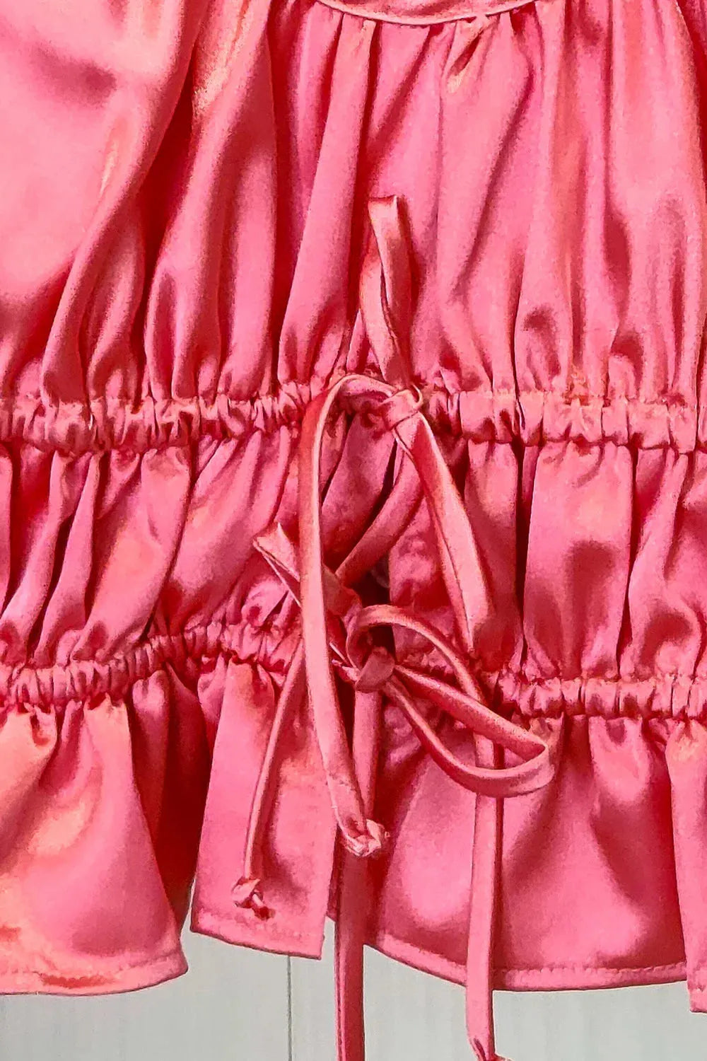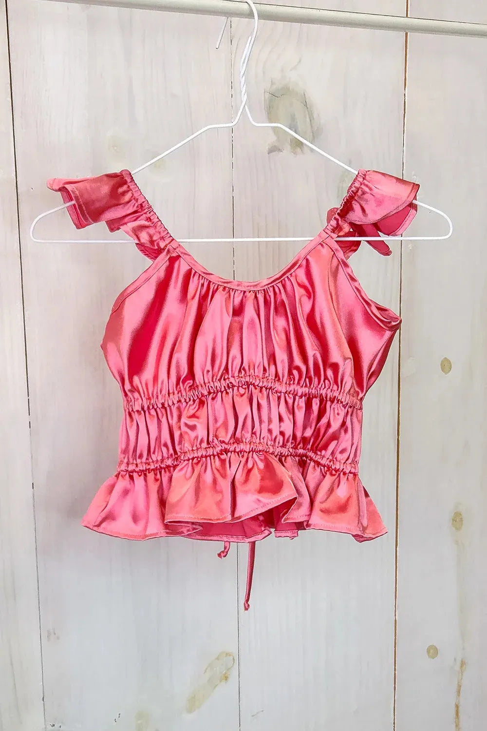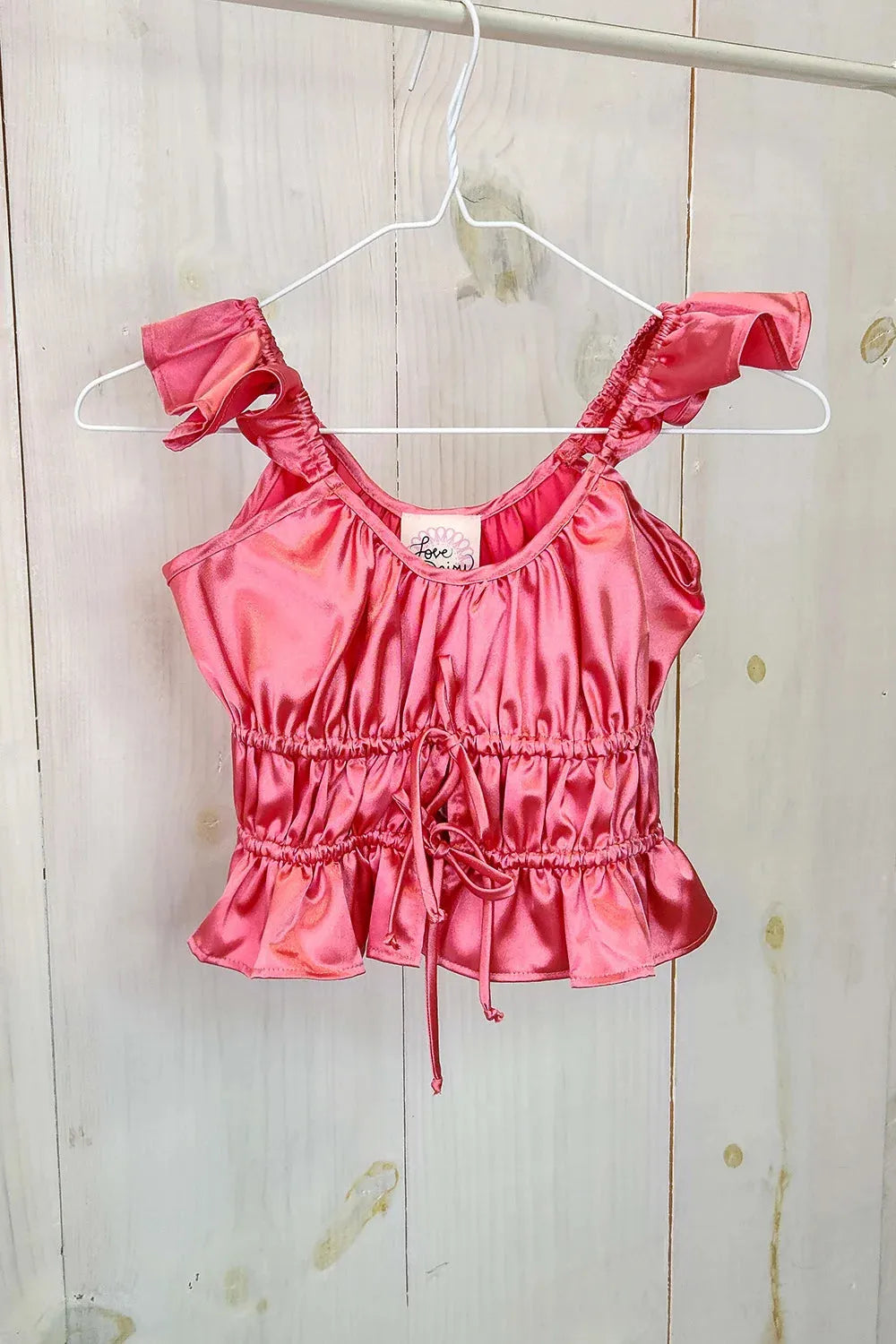 Girls Satin Ruffle Strap Sleeve Drawstring Detail Top