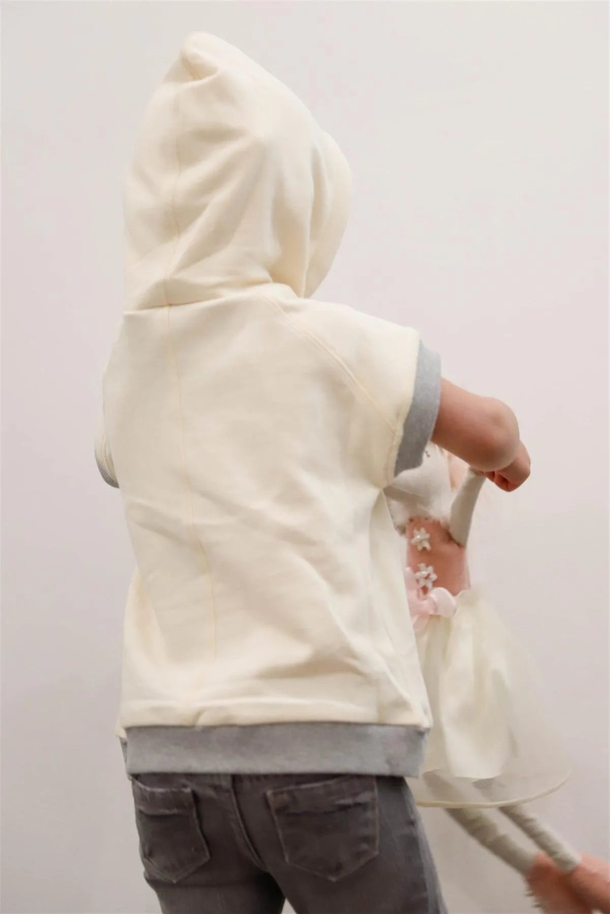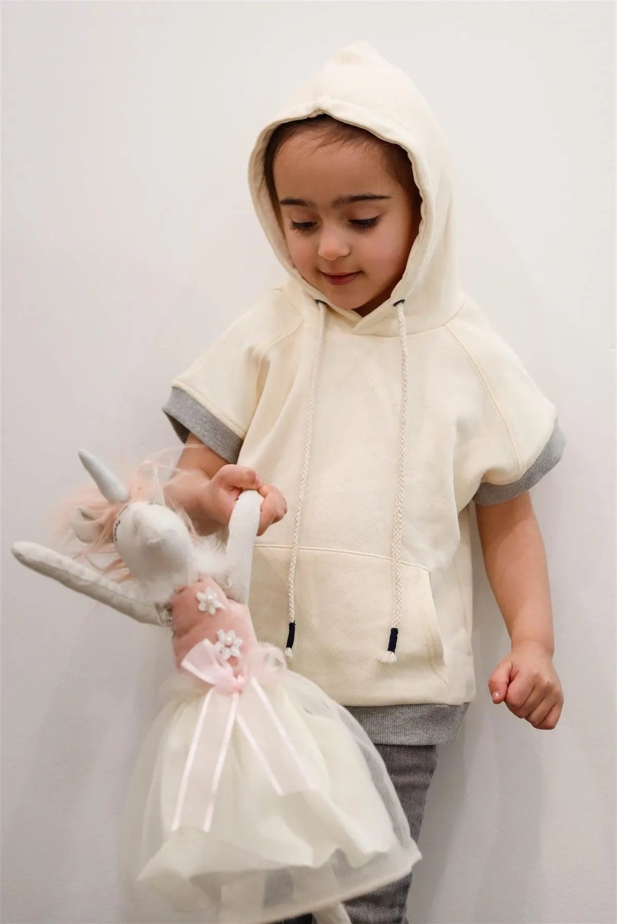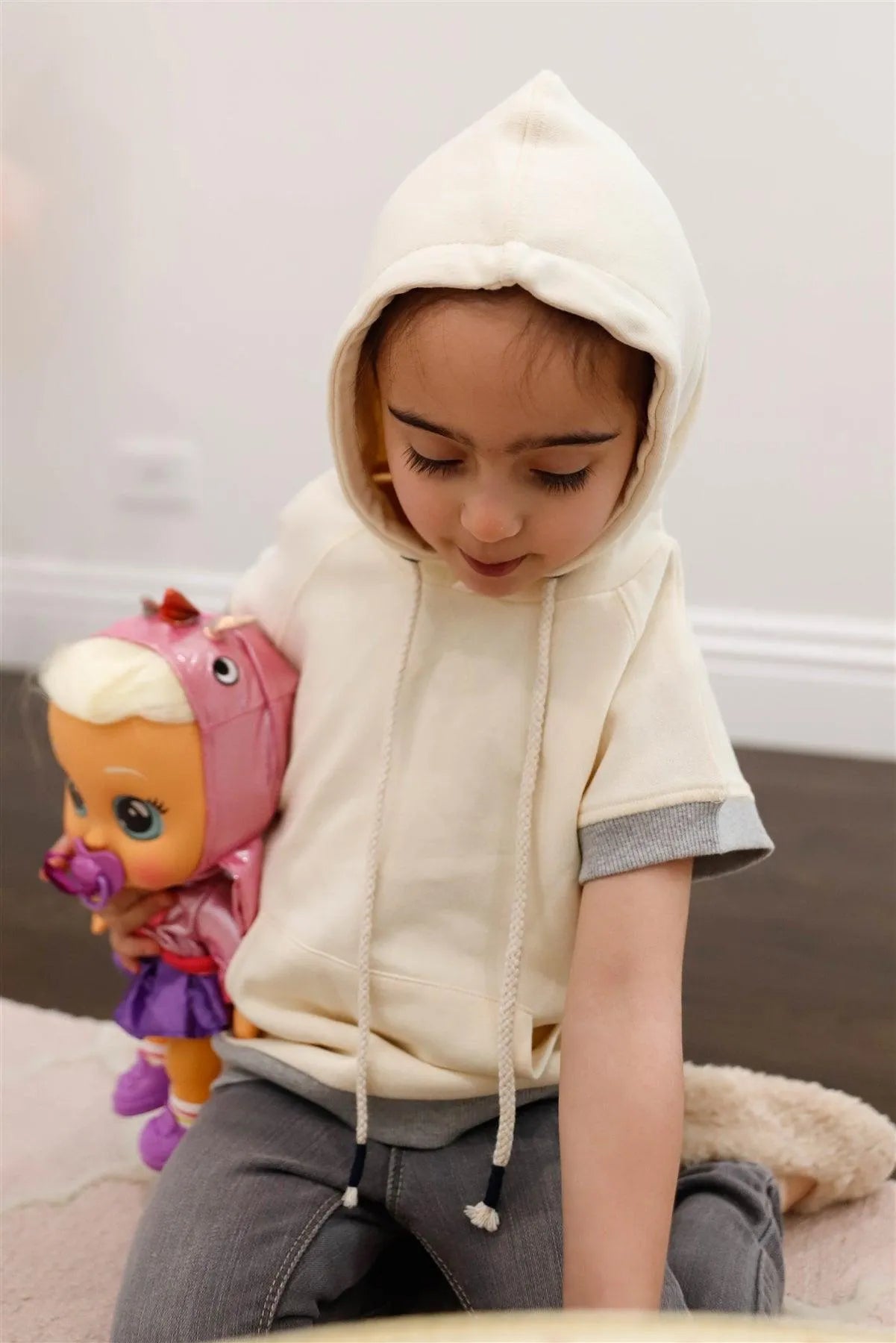 Toddler Girls Cream Contrast Cuffs & Hem Short Sleeve Hooded Sweatshirt /1-1-1-1
