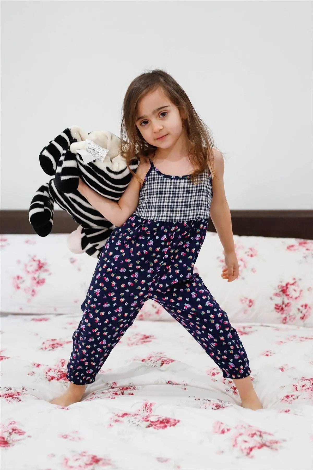 Toddler Girls Navy Floral & Plaid Print Back Button Up Detail Sleeveless Jumpsuit /2-2-2