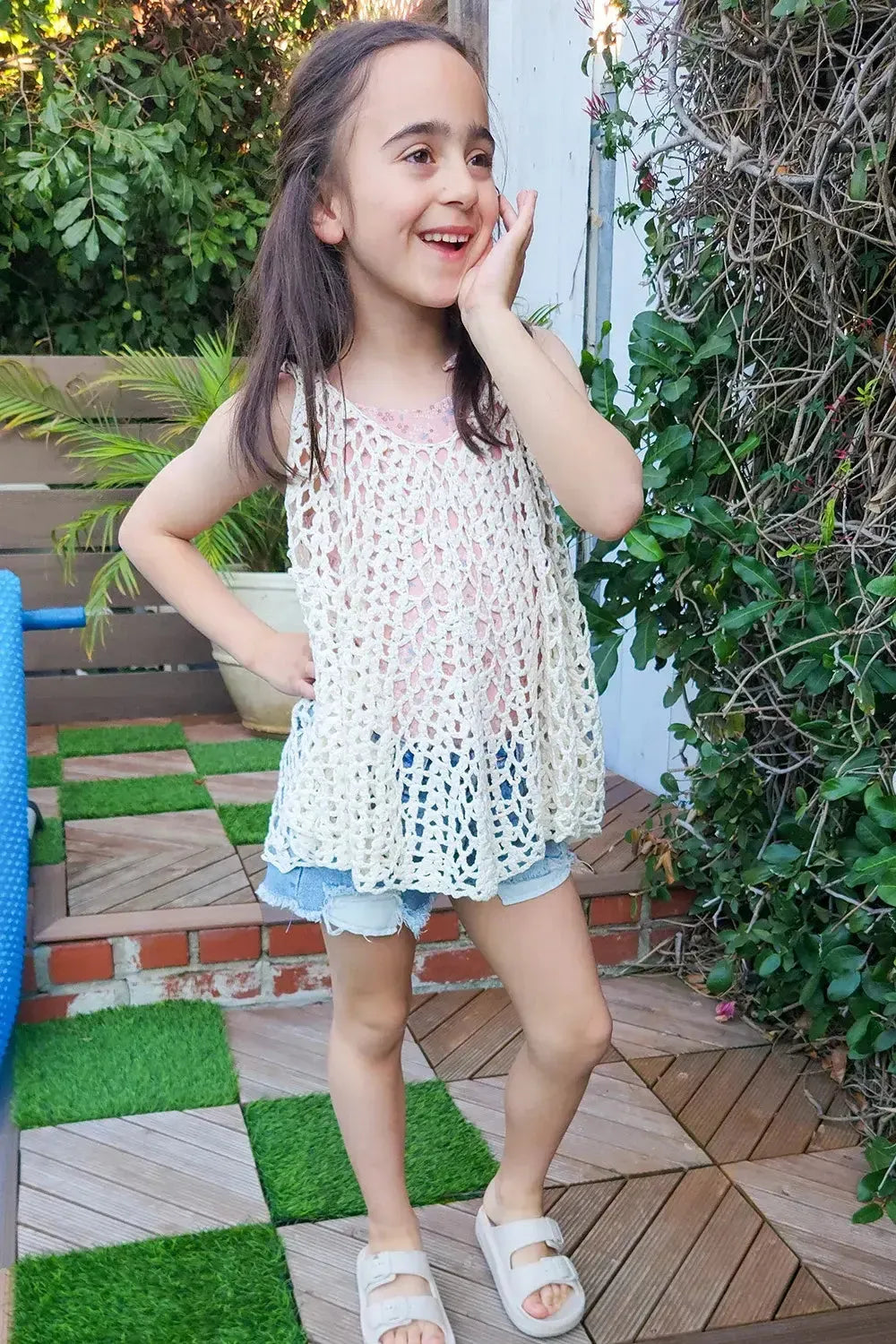 Girls top: sleeveless, crochet, round neckline, cover up, flare fit, back button closure, cute boho style. This eye-catching piece features a natural pattern adding a touch of sparkle that lights up any sunny day.