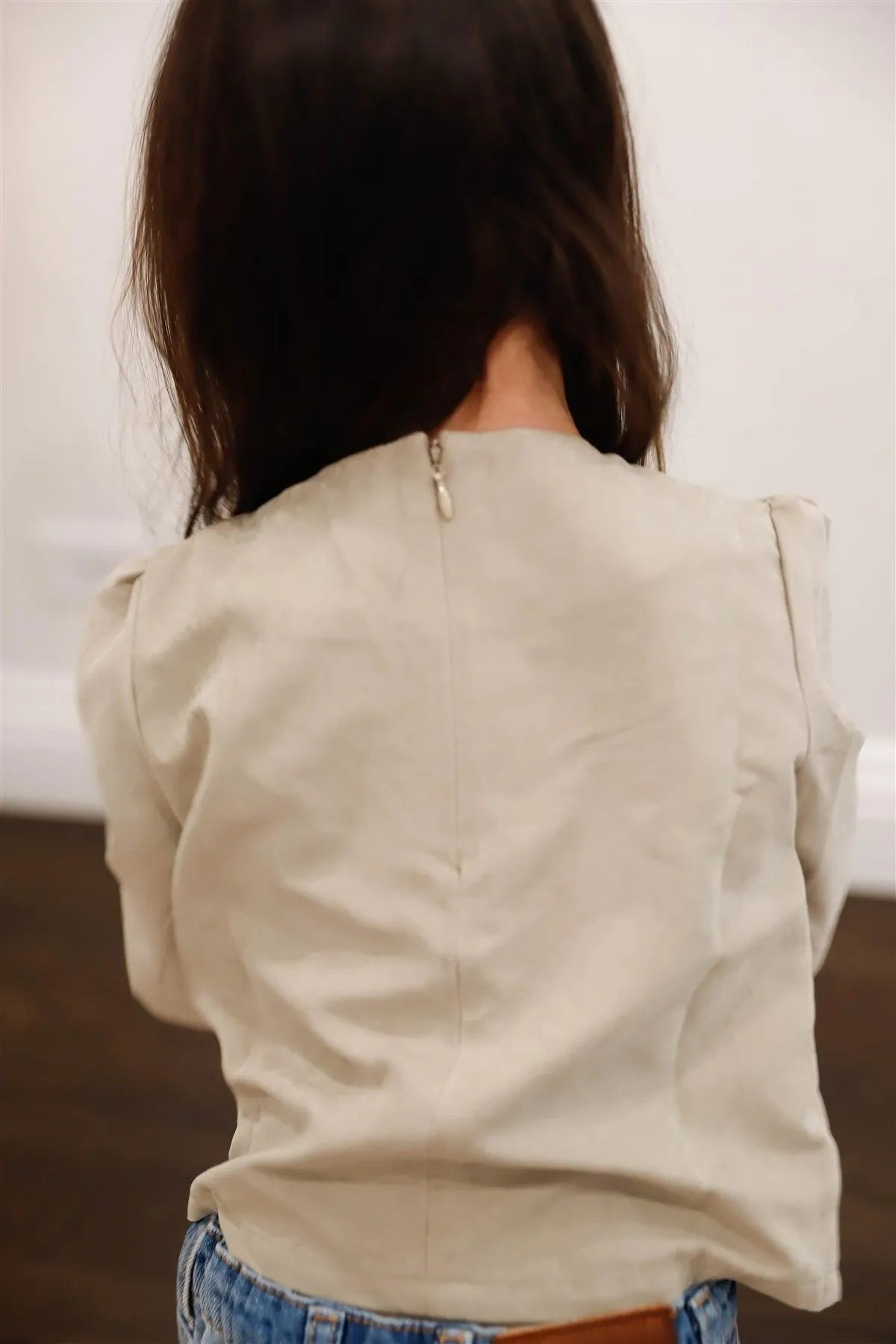 🖤 Item Features: Khaki, solid color, suede effect material, front button up detail, round neckline, long puff balloon sleeves, with elasticized cuffs, back hidden zipper, non-stretchy, unlined, non-sheer, cute, elegant, trendy