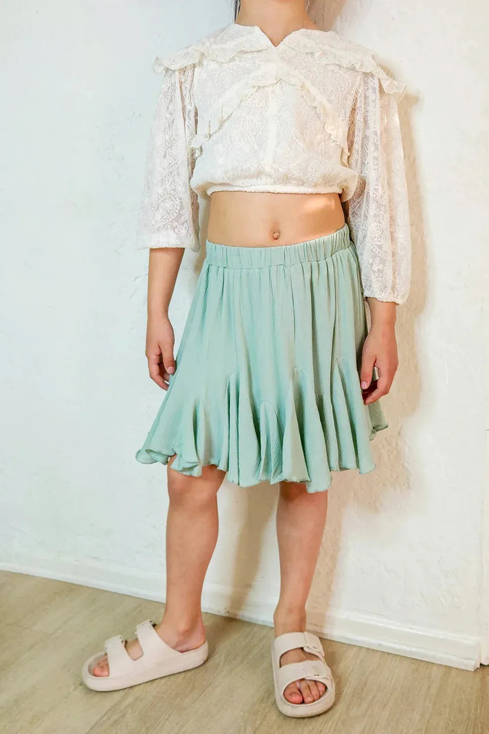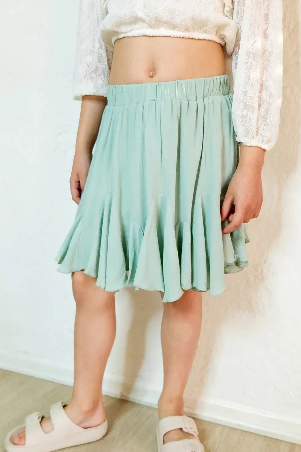 Girls Mint Green Sage Elastic Waist Flowy Ruffle Skater Mini Skort
