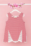 Girls dress features: Red and white stripped print, sleeveless, ribbed material, white floral lace inserts, very stretchy, unlined.Size 6 Item Measurements: Length: 18", Bust: 24"True to Size