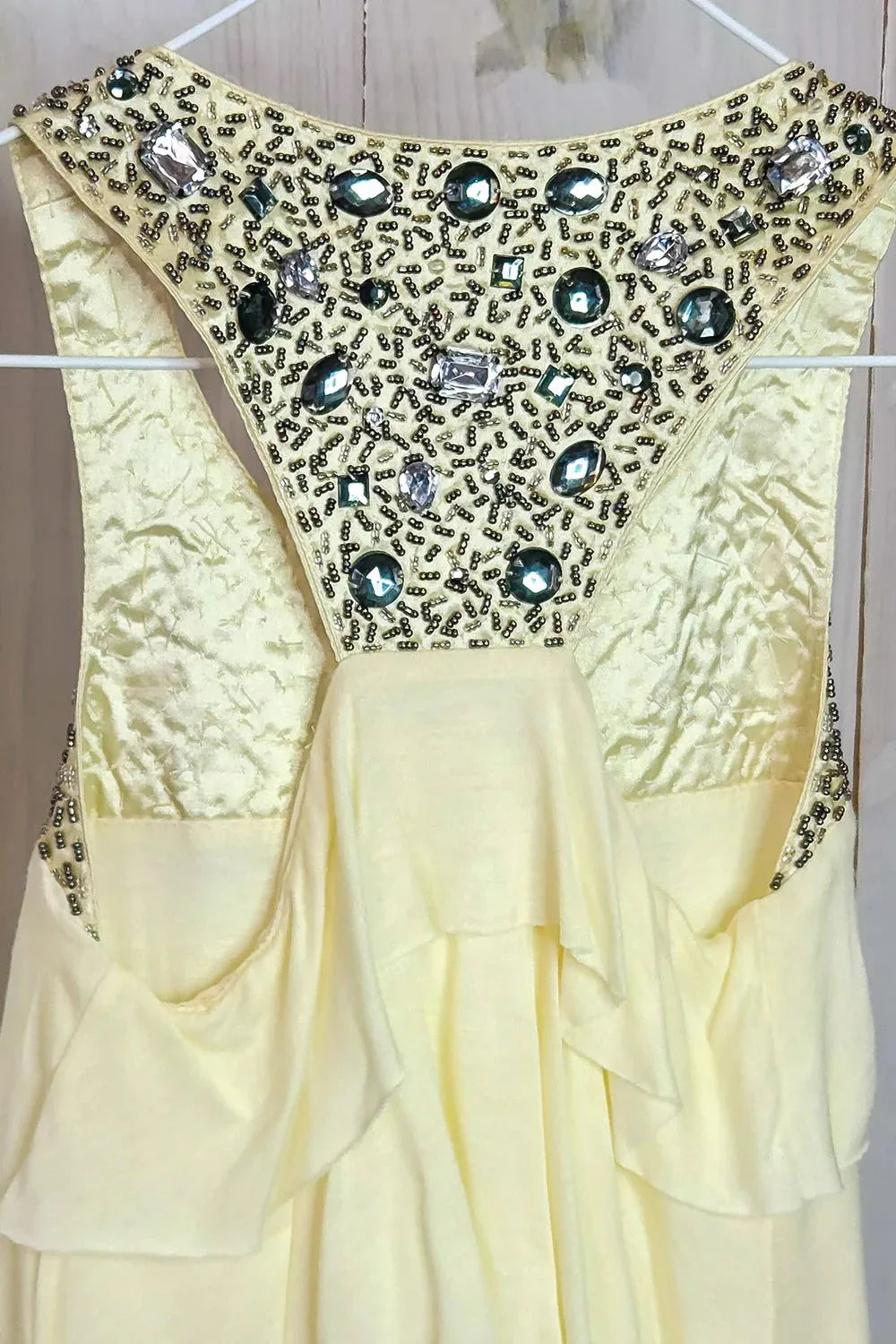 🖤 Features: sleeveless, round neckline, stone diamond beads, open T shape back, ruffle details, not see through, midi length.