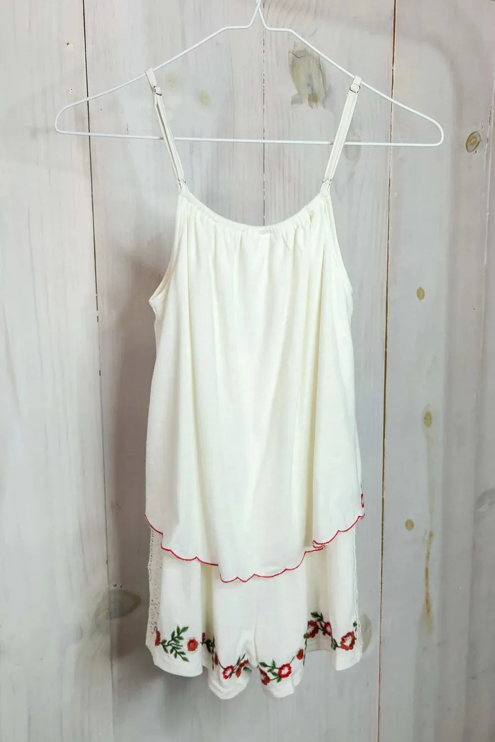 Girls summer romper: solid color, floral embroidered, side crochet details, elastic neckline, elastic waist, sleeveless, round neck line, adjustable strap, lined. Stay cool and comfortable all summer long with this beautiful romantic romper, designed to make you feel effortlessly cute!