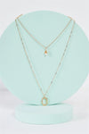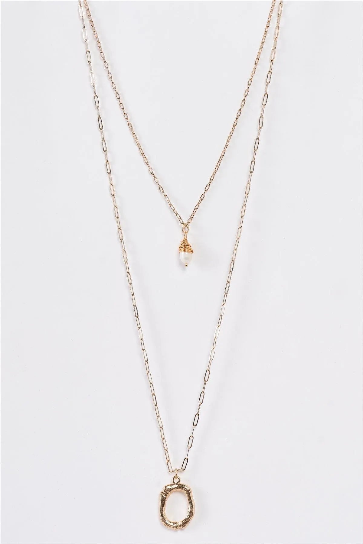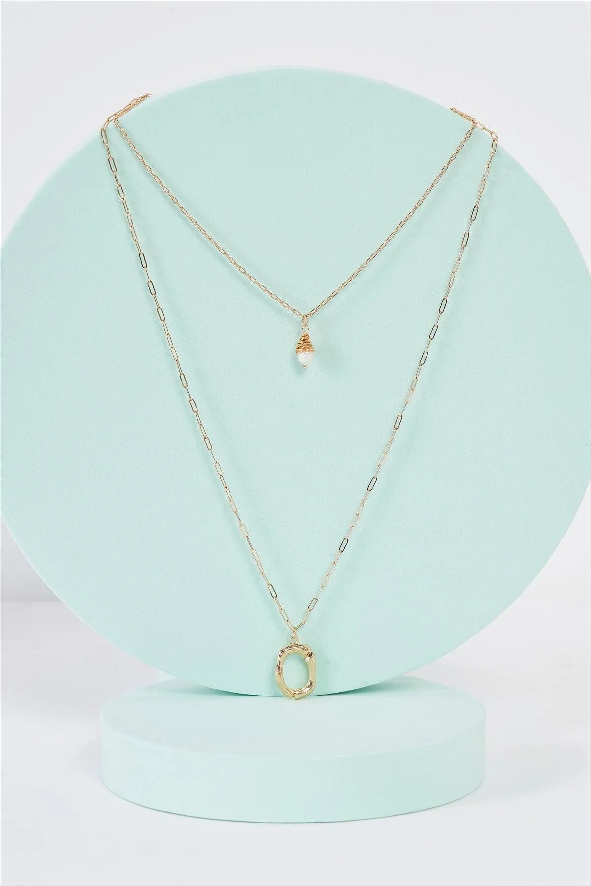 Gold Linked Double Chain Circle Tear-Drop Pearl Charm Necklace