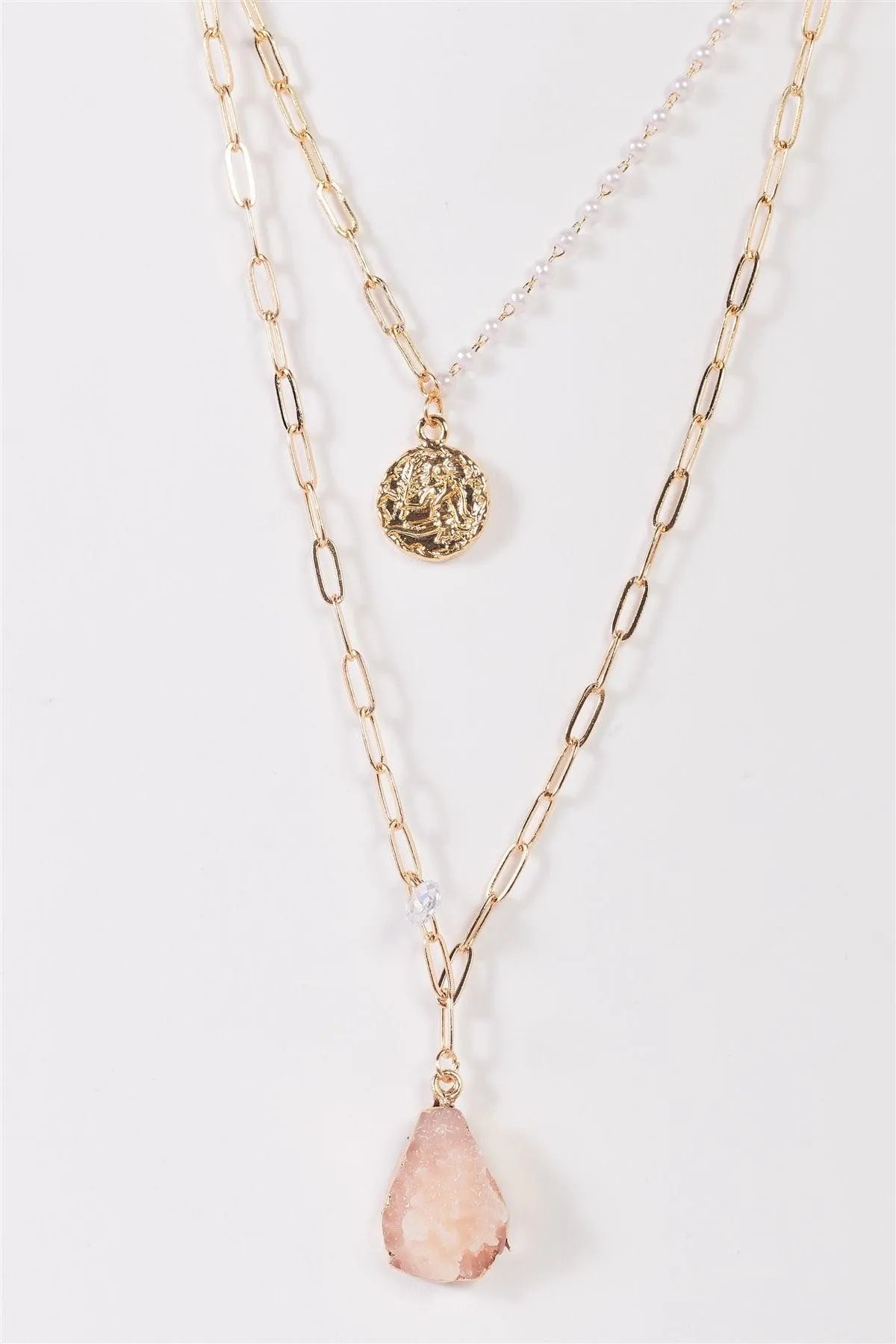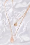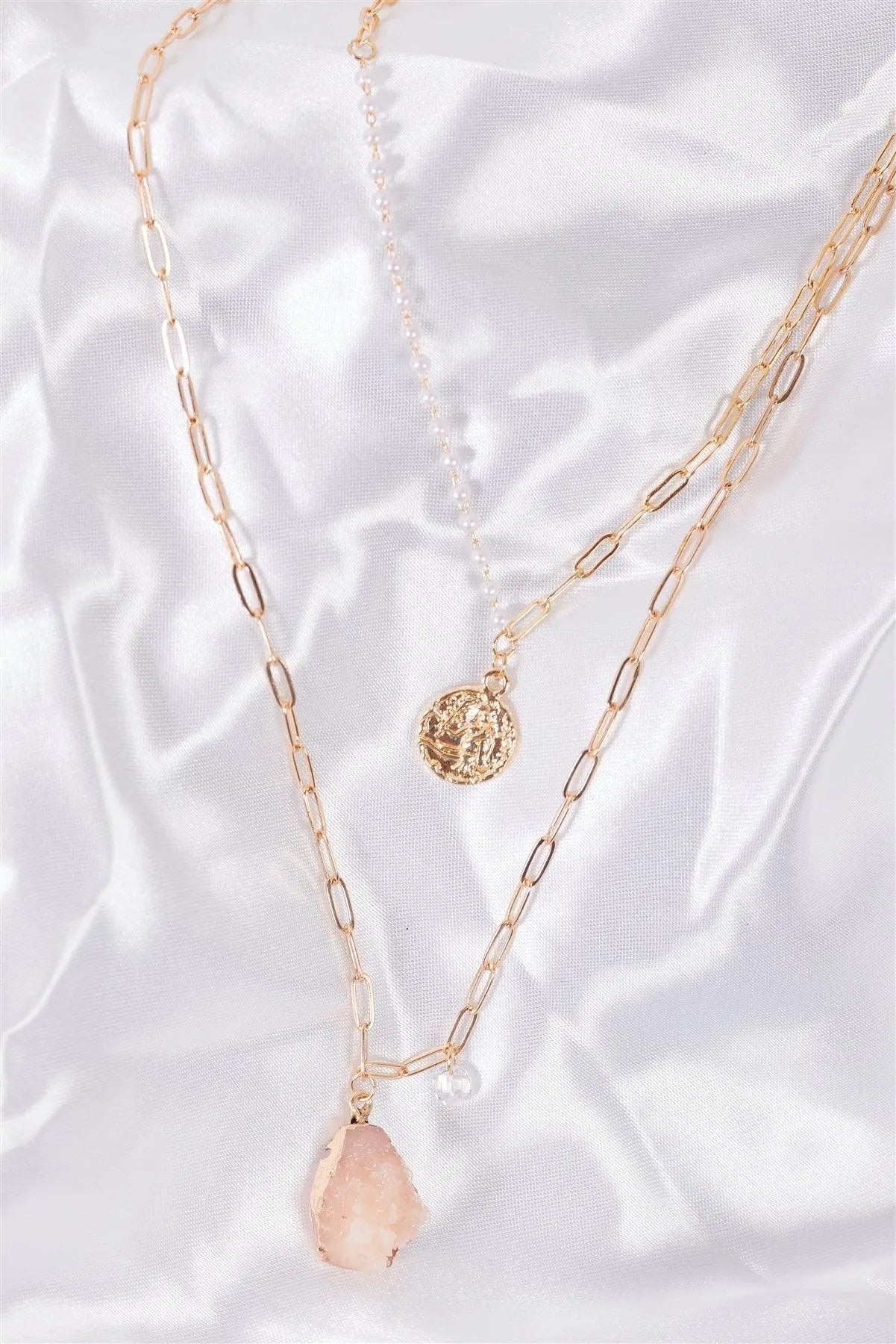 Gold Double Chain With Rose Quartz Faux Stone & Gold Stamp Pendant Necklace /3 Pieces