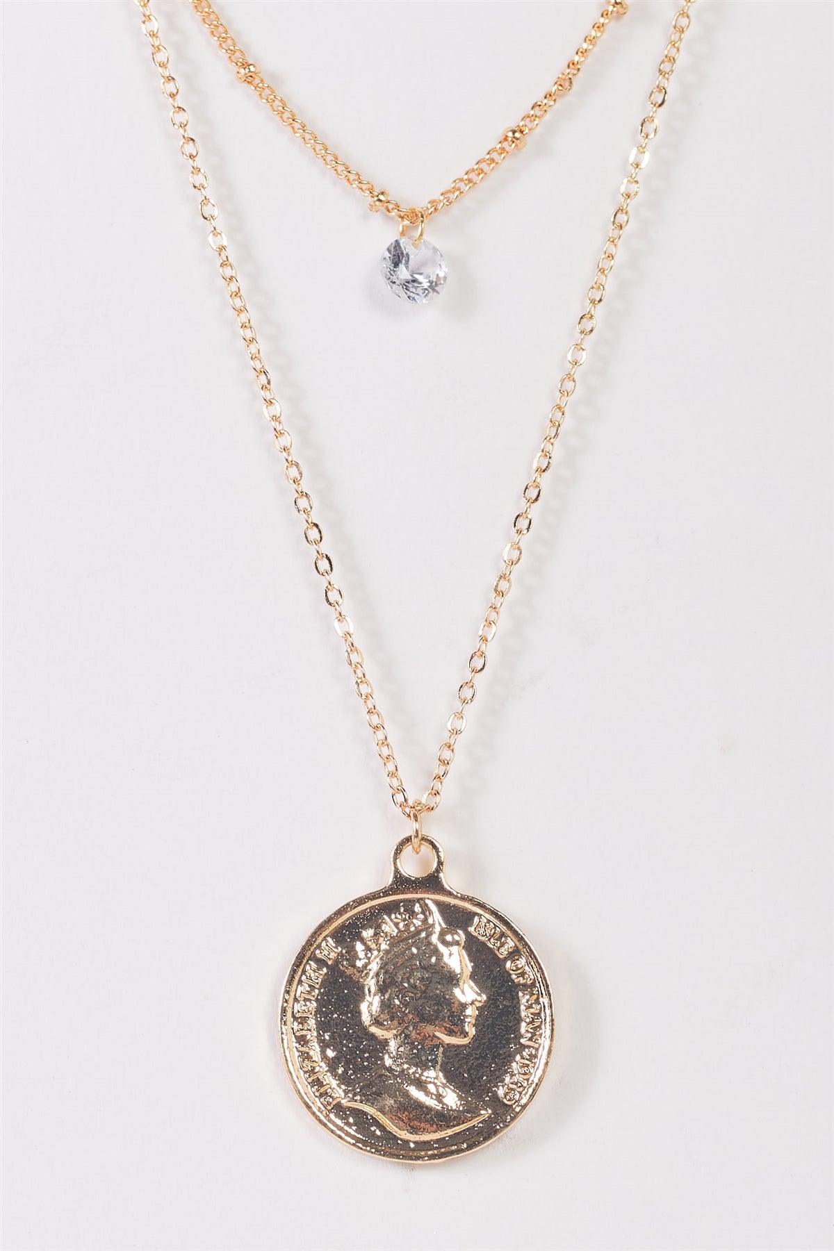 "Dos Pesos" Gold Double Chain Coin Pendant Tiny Crystal Necklace
