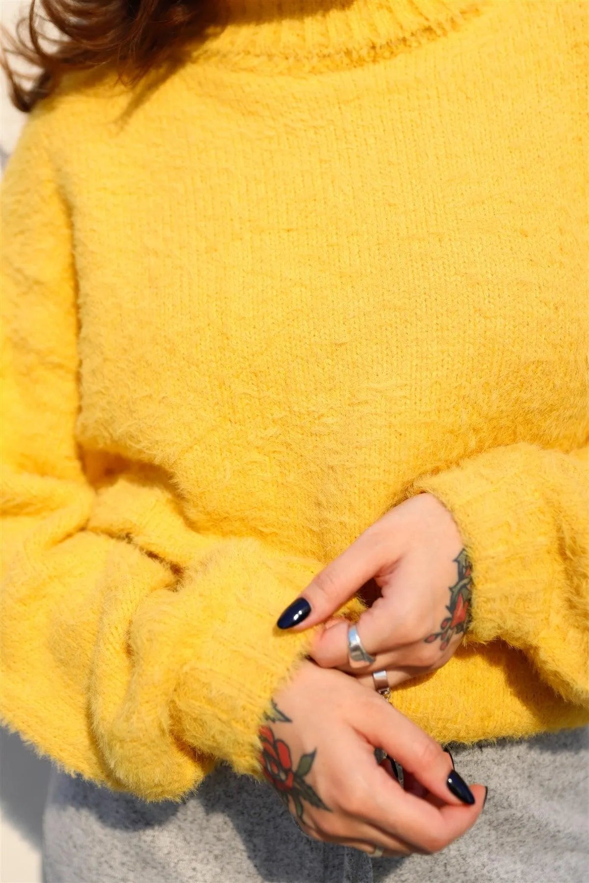 🖤 Item features: Gold, solid color, knit, fuzzy, turtleneck, dropped shoulders, balloon cuffed sleeves & hem, loose fit, stretchy, soft to touch, warm, stylish, bright, fall/winter collection