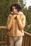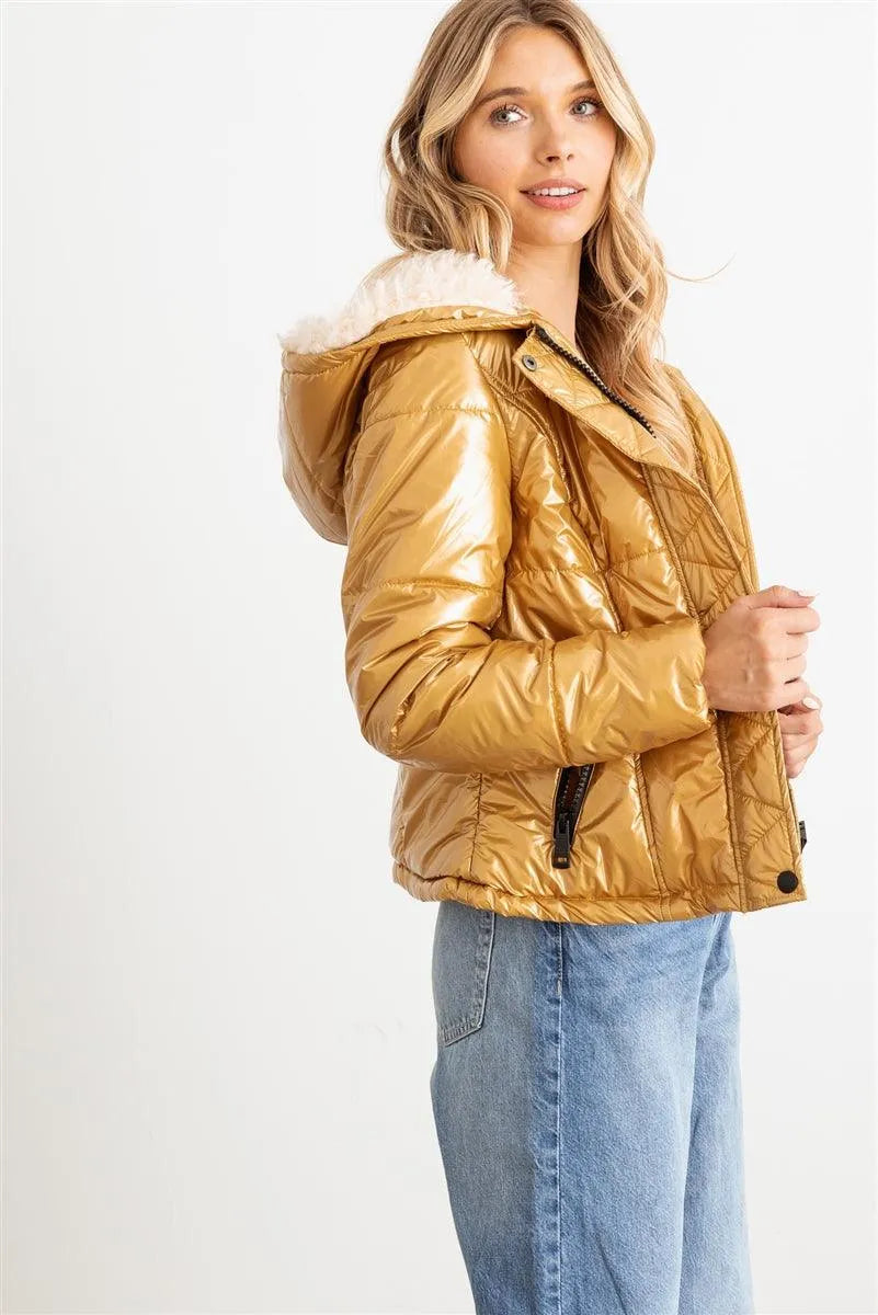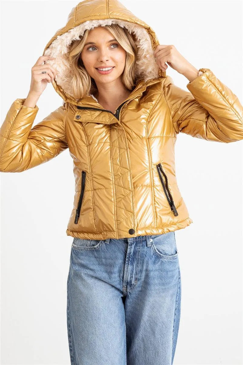 Gold Long Sleeve Fuzzy Faux Fur Hood Padded Jacket /1-1-1-1