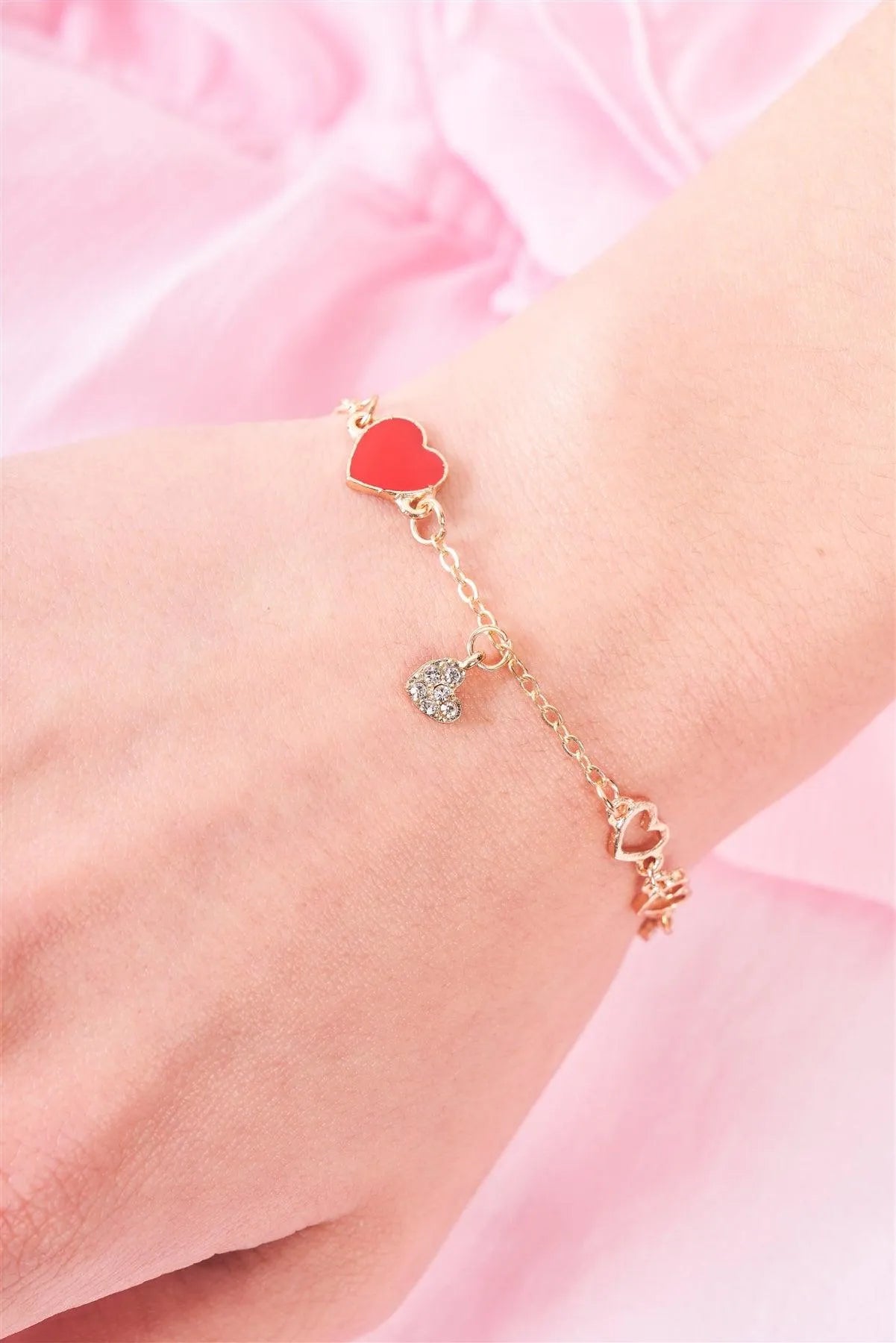 🖤 A chain bracelet featuring rhinestone heart charm, cutout hearts, red heart