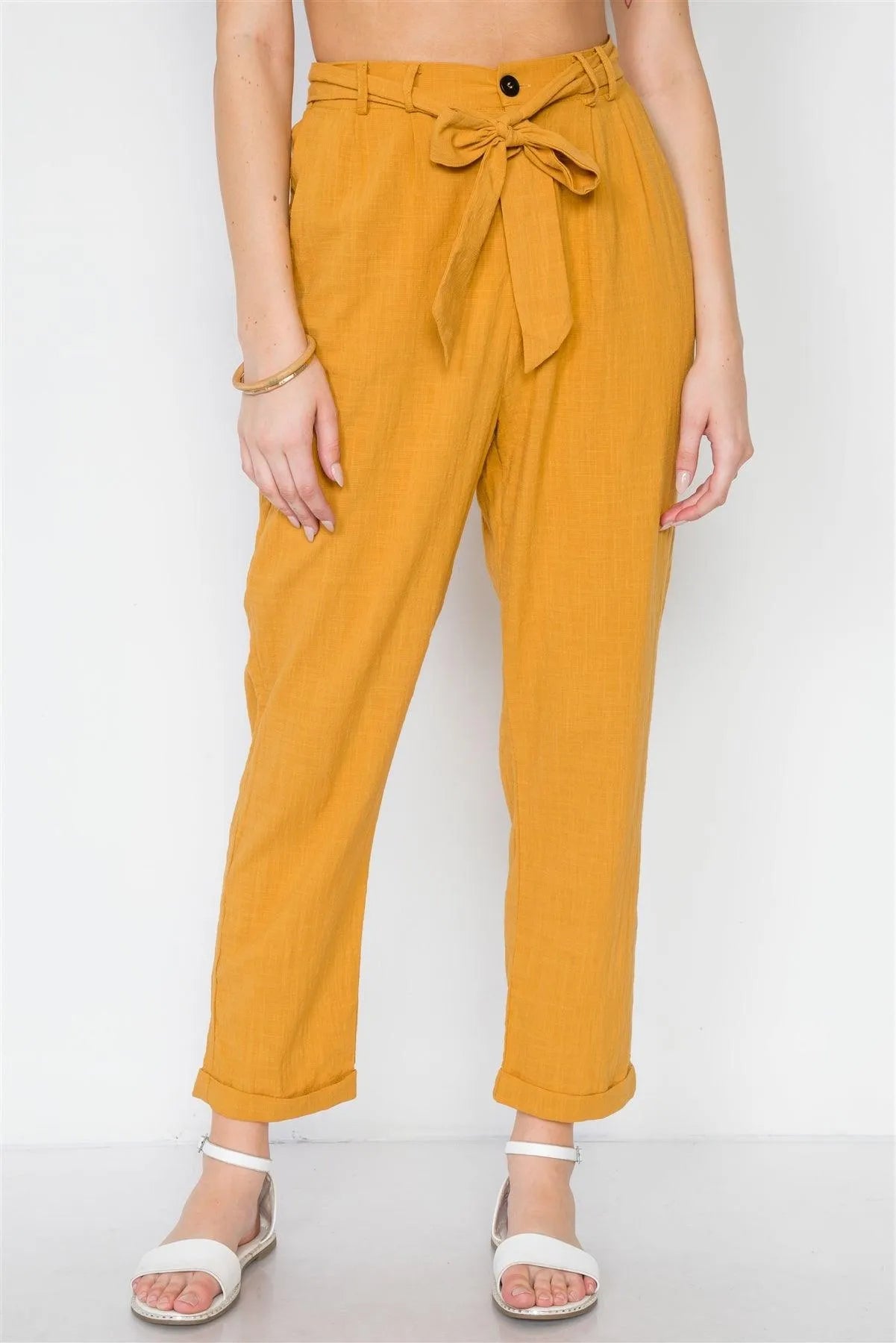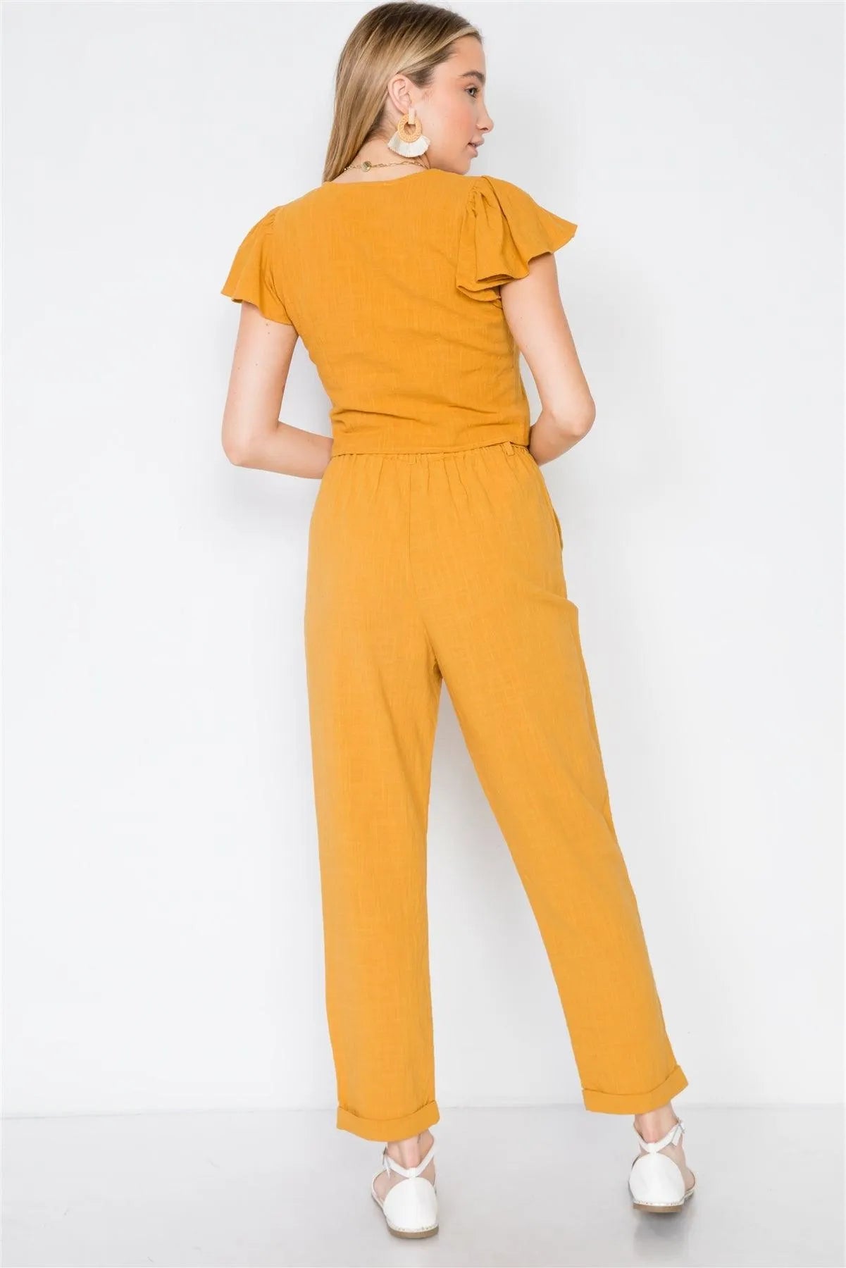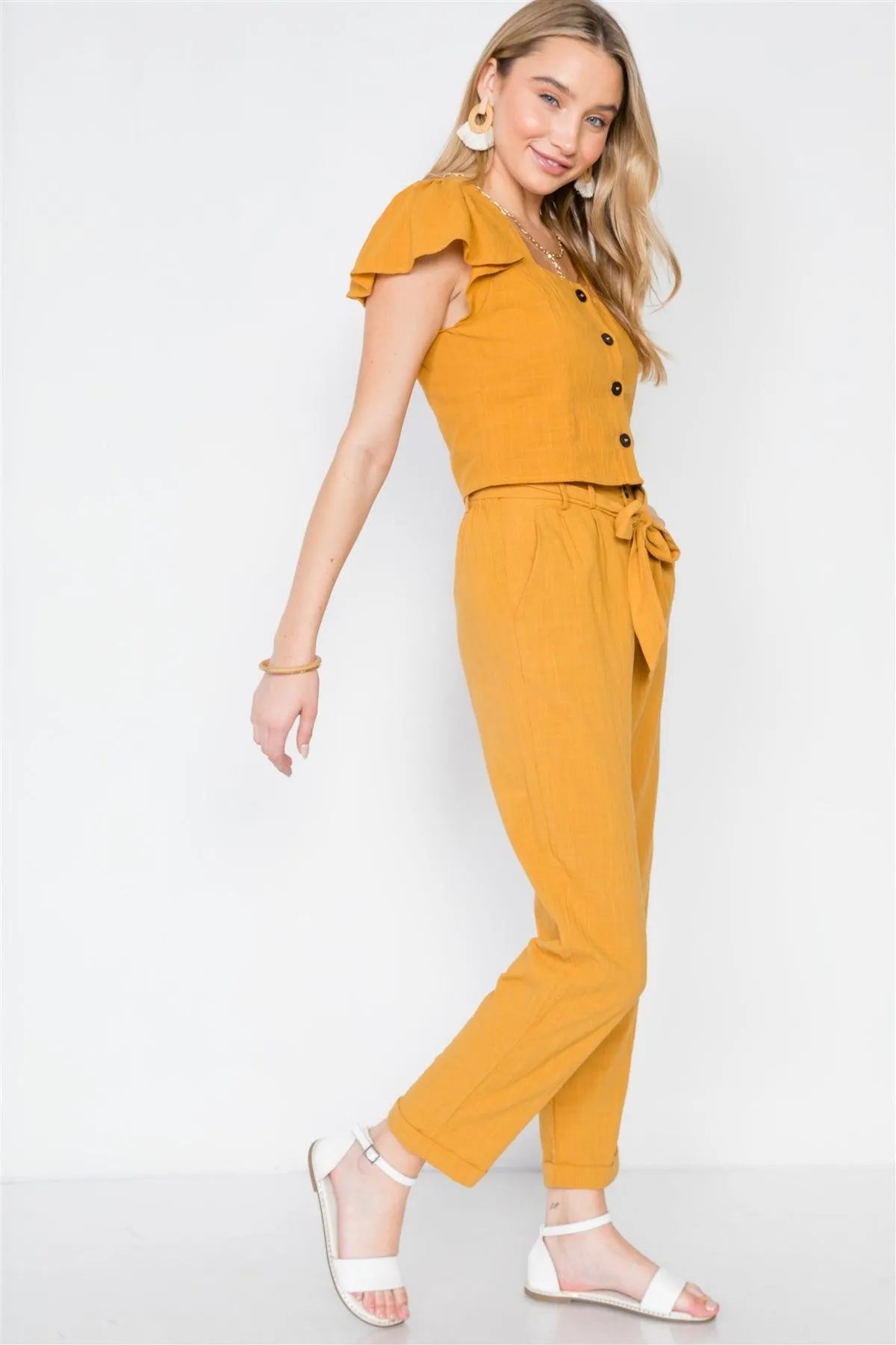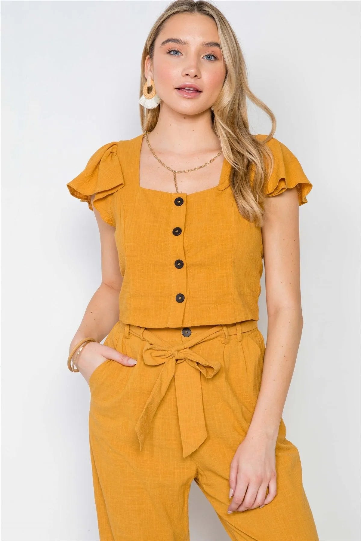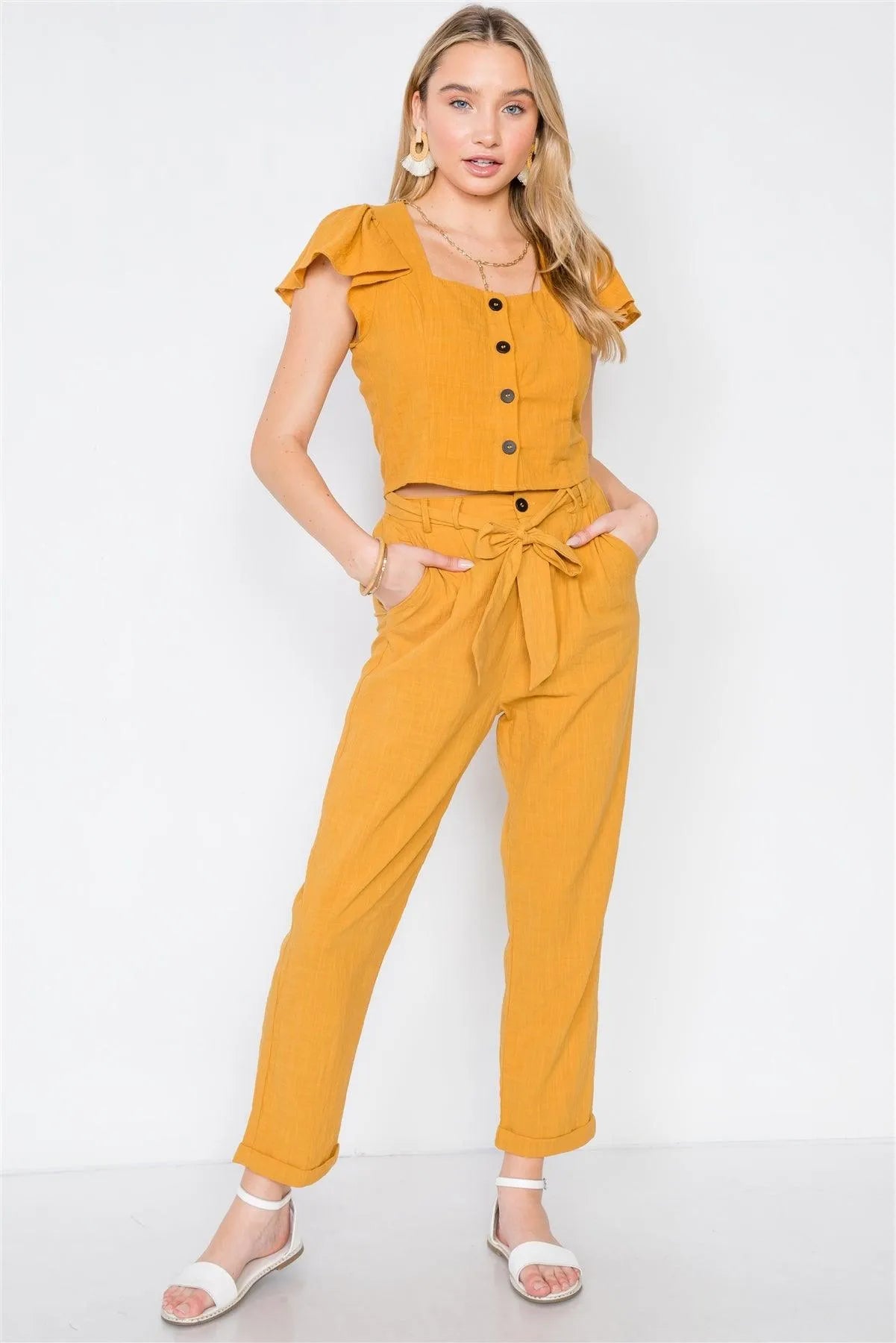 Top features: short flounce sleeves, button front closure, no stretch, unlinedPants features: high waisted, zip-fly closure, self-tie sash, cuffed hem, no stretch, unlinedModel is 5'8 wearing a size Small (Waist: 24", Bust: 32B, Hips: 34")Size Small Top Measurements: Length: 18", Bust: 34Size Small Pant Measurements: Length: 45", Waist: 24"True to size