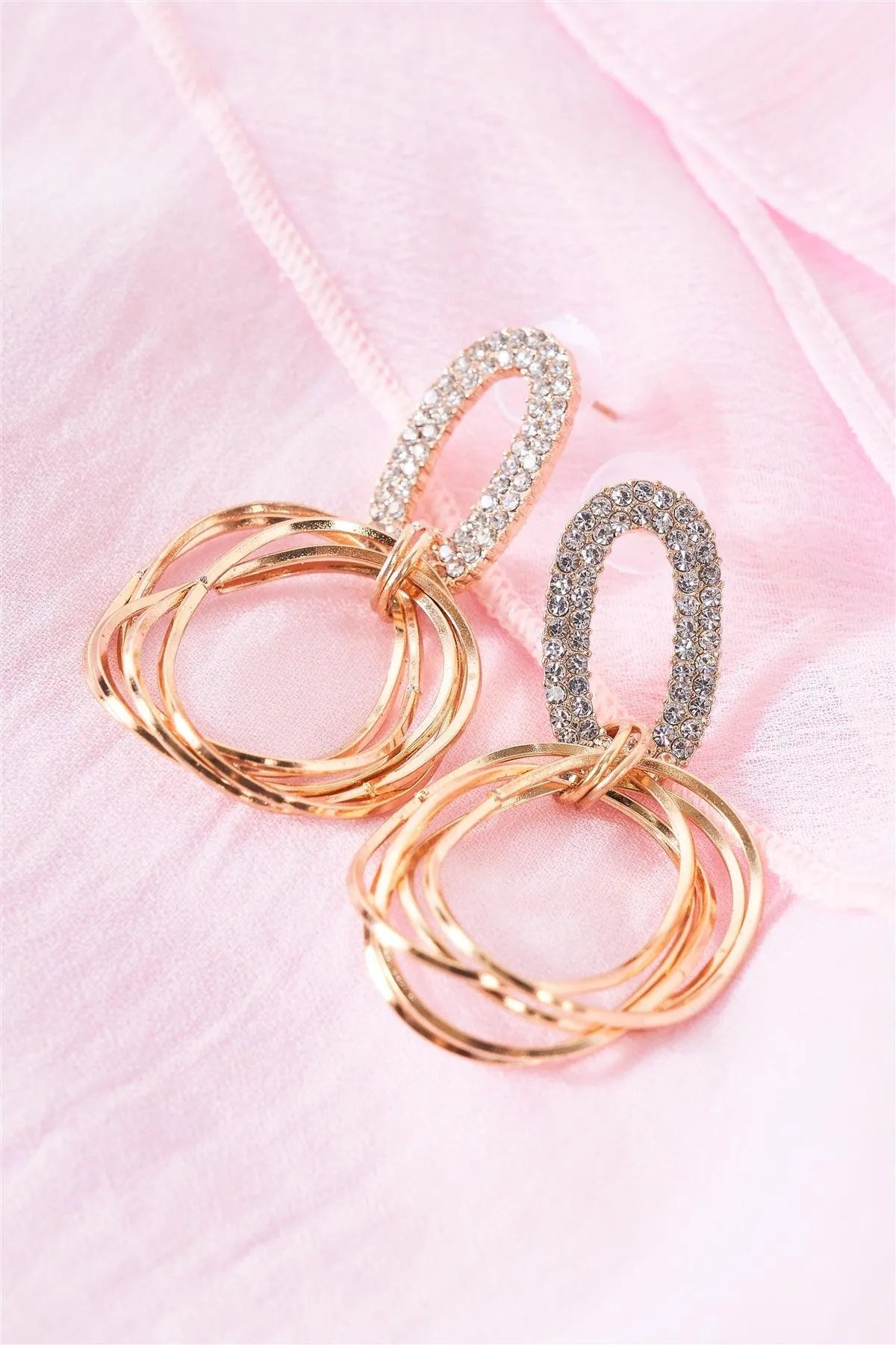 🖤 A pair of gold drop earrings featuring one small oval with rhinestone and multiple medium hoop