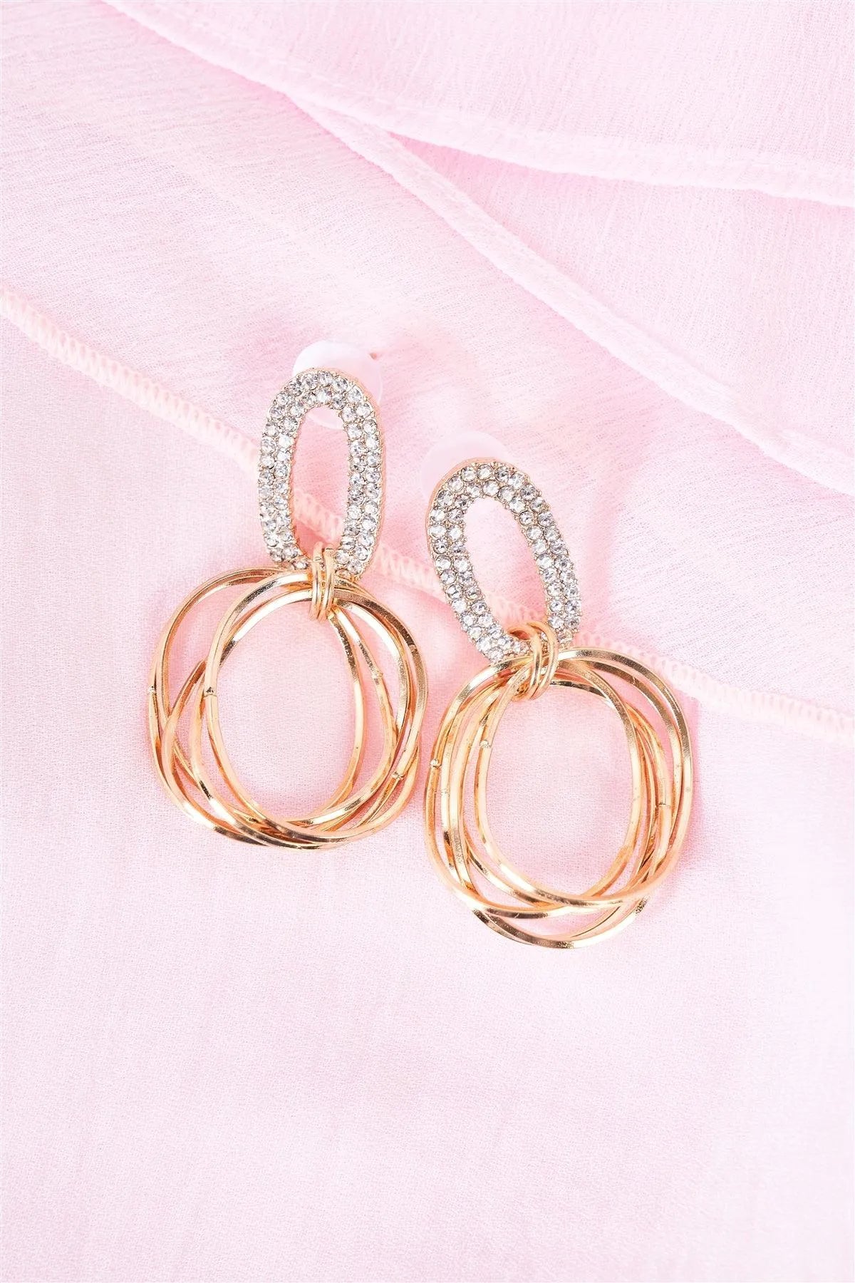 Gold Rhinestone Linked Multiple Hoop Drop Earrings /3 Pairs