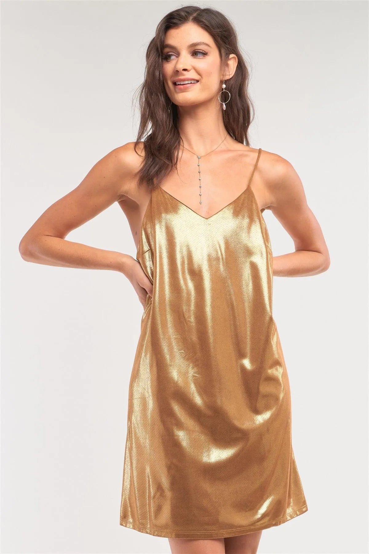 Gold Shiny Sleeveless V-Neck Swing Adjustable Cami Mini Dress /1-2-2