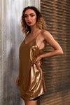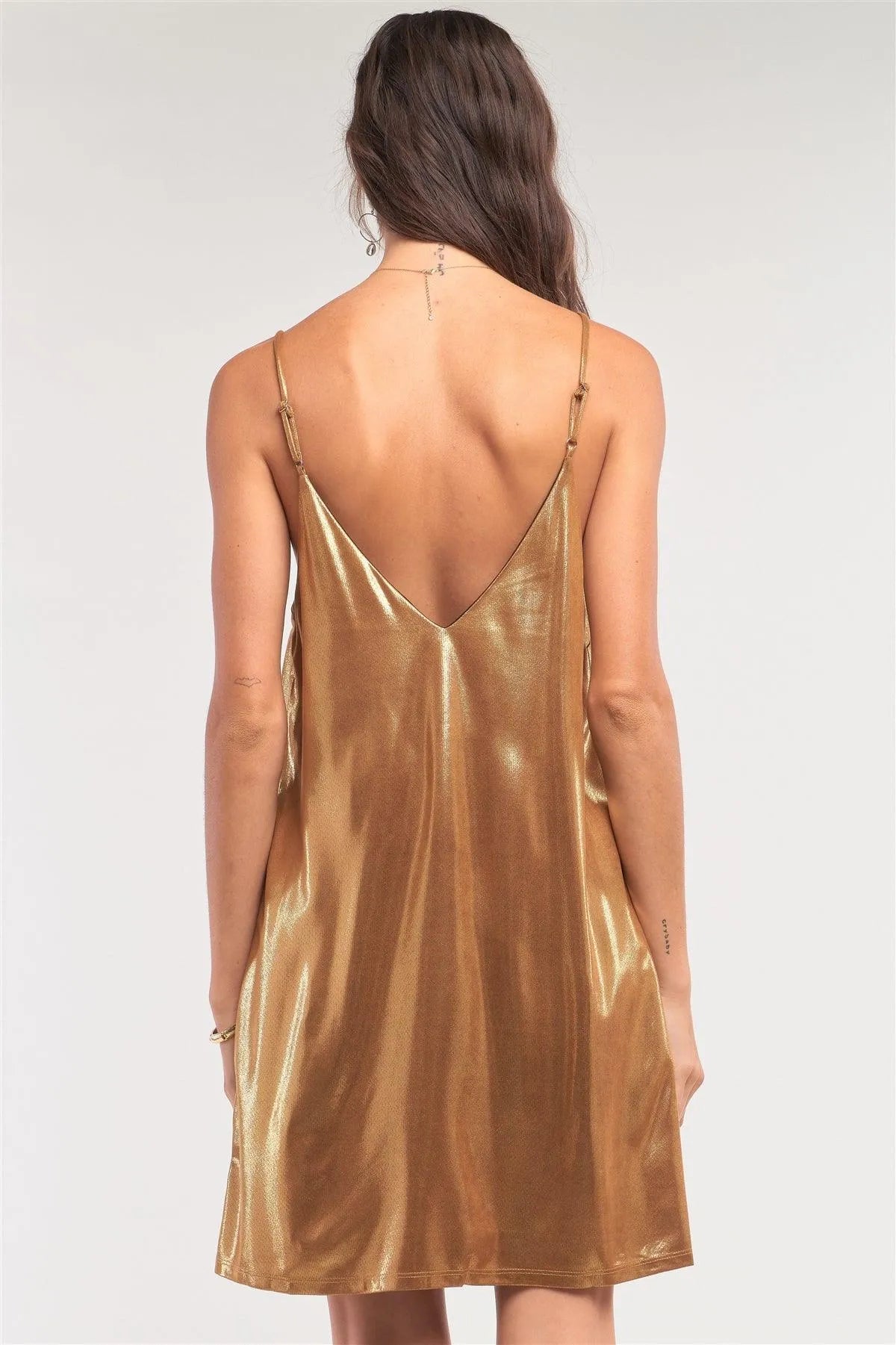 Gold Shiny Sleeveless V-Neck Swing Adjustable Cami Mini Dress /2-1-2