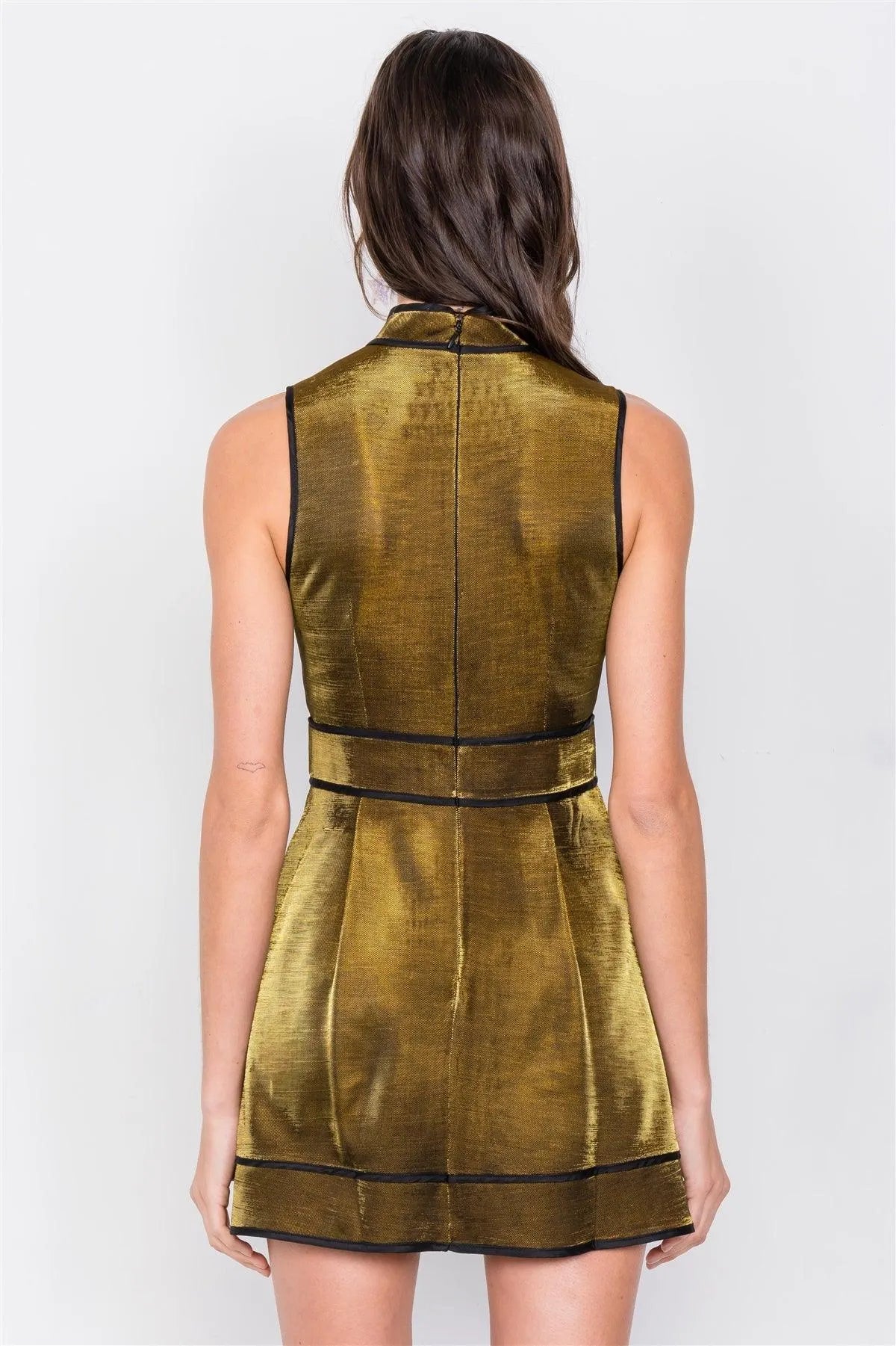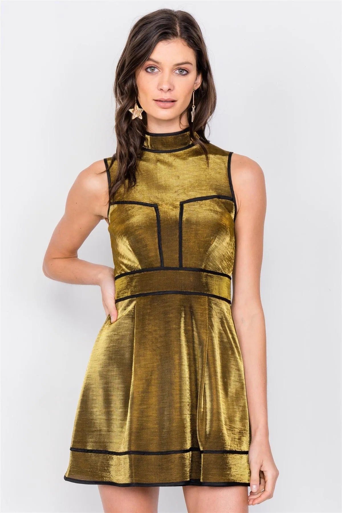 Gold Silver Metallic Mock Neck Skater Mini Dress /3-2-1