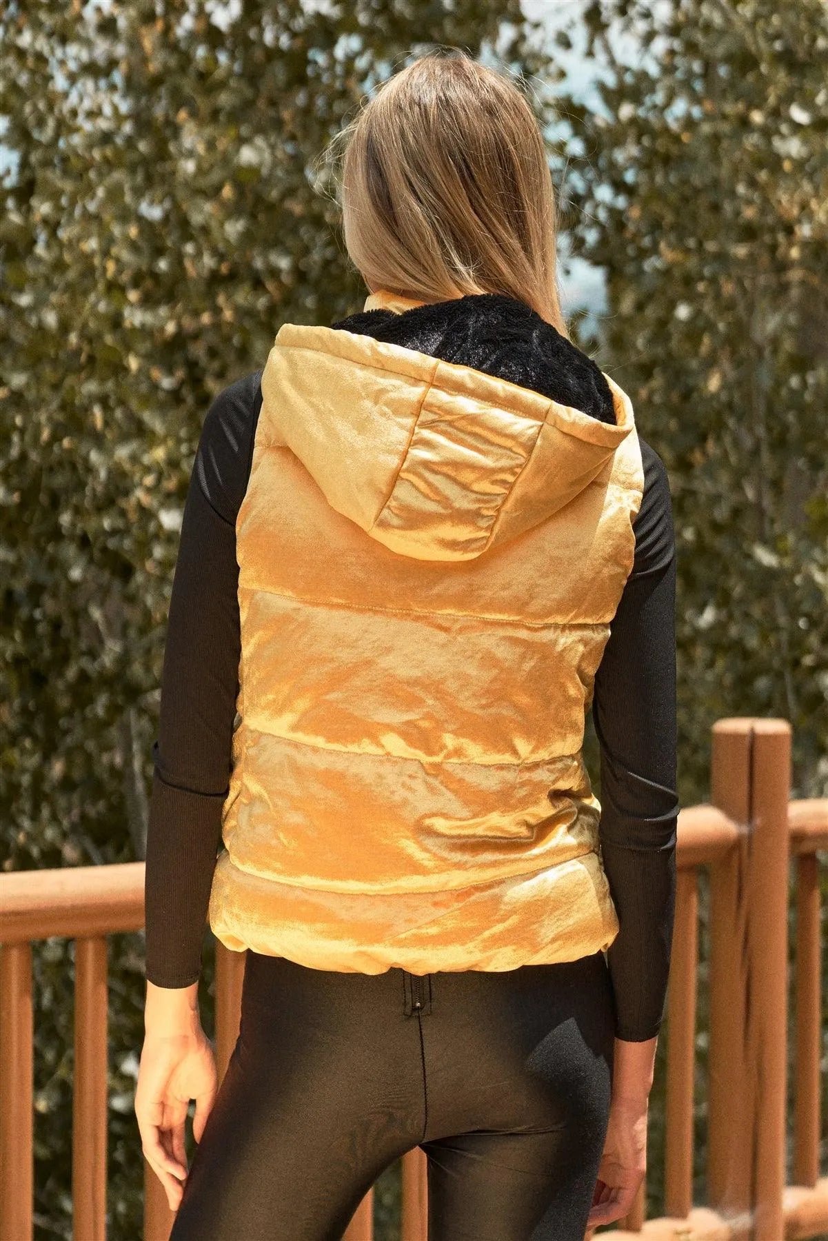 Gold Velvet Sleeveless High Neck Hooded Puffer Vest