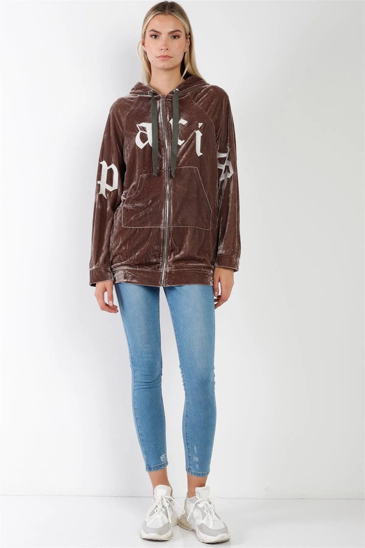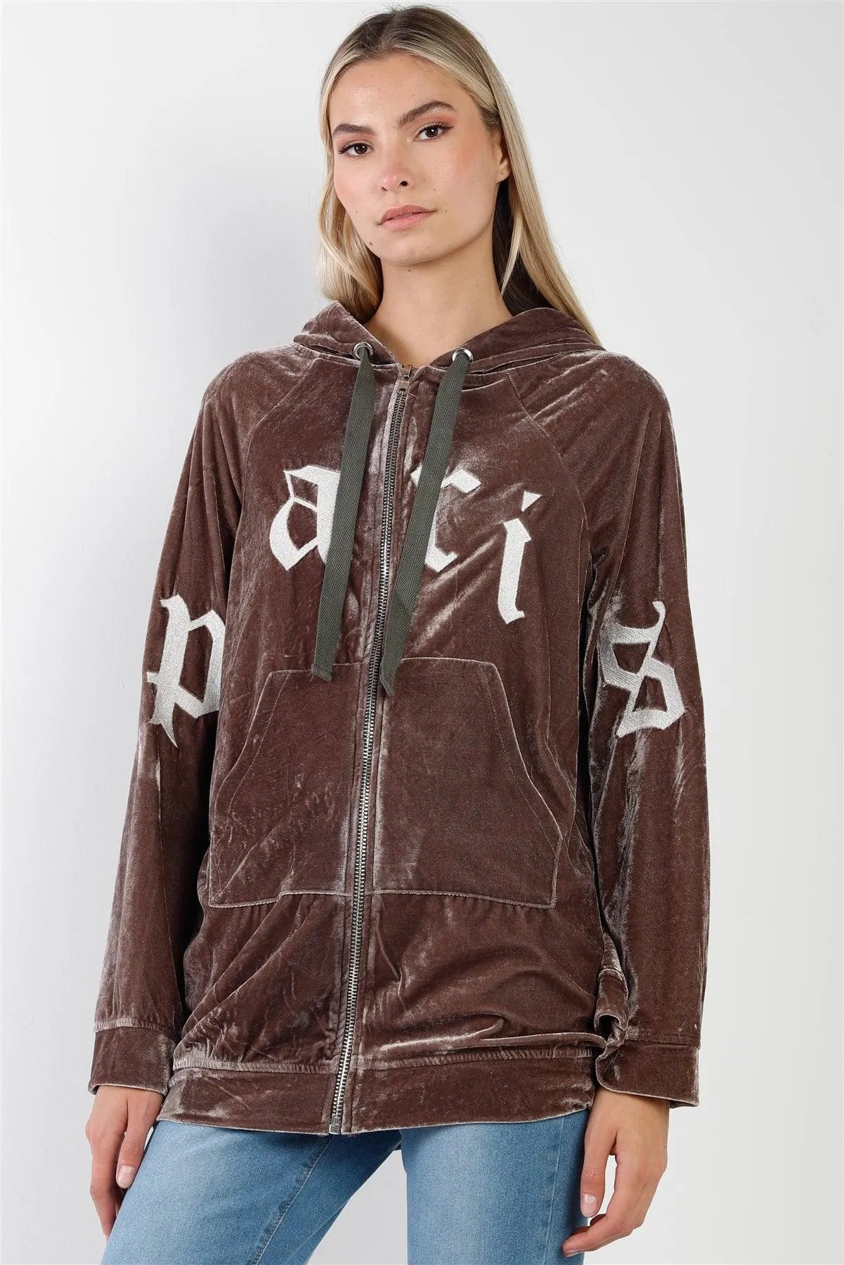 Toffee Graphic Letters Zip Up Hoodie Drawstring Velvet Sweater /3-2-1