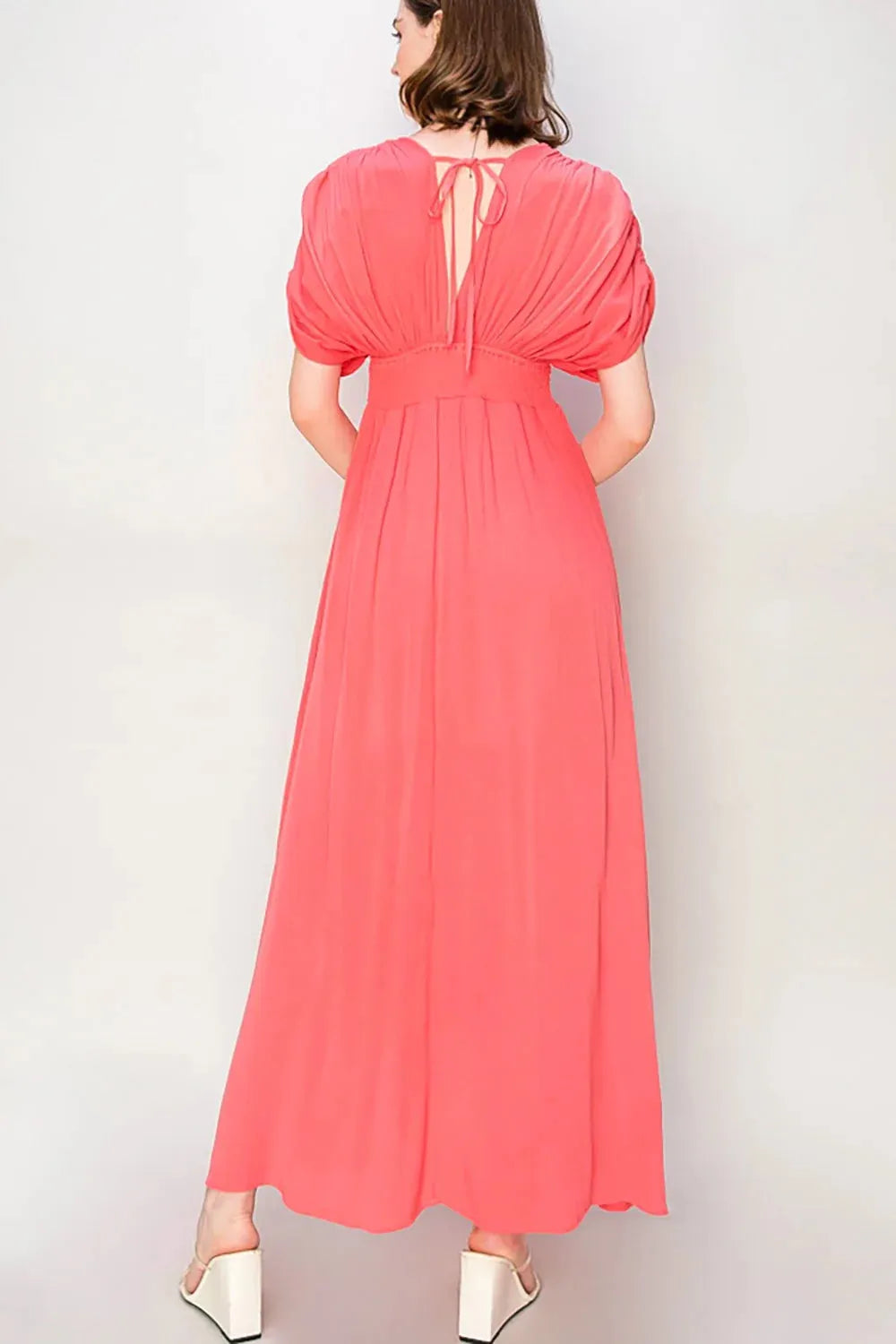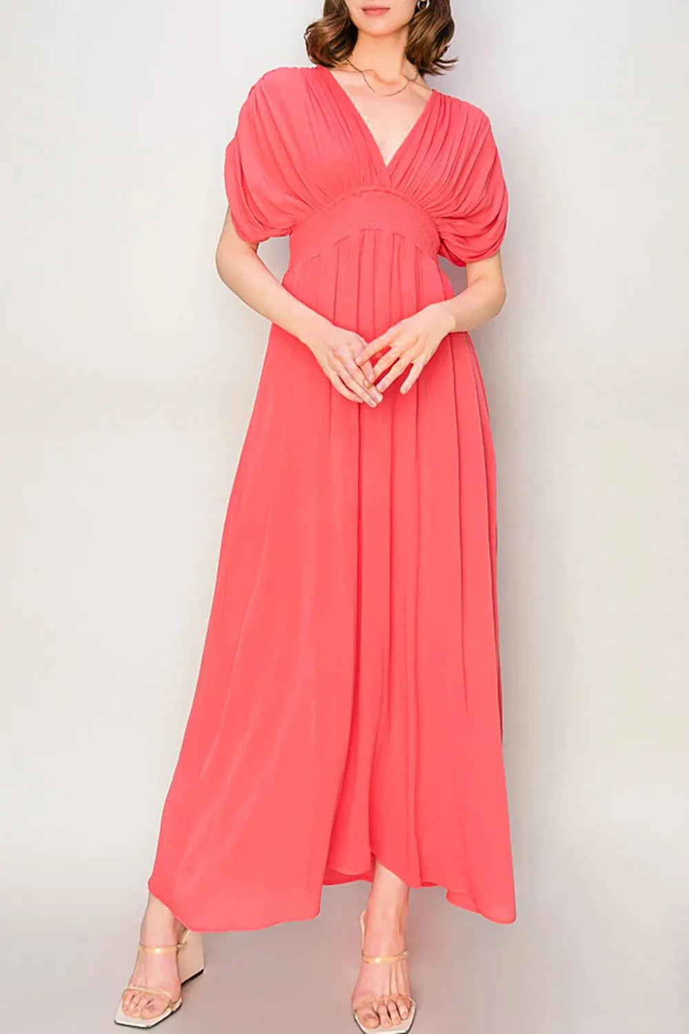 🖤 Features: V-neckline, empire waistline, pleated bodice, dolman sleeves, tie-back detail, ankle-length, flowy silhouette, lightweight fabric, versatile design, available in coral, mint, and white